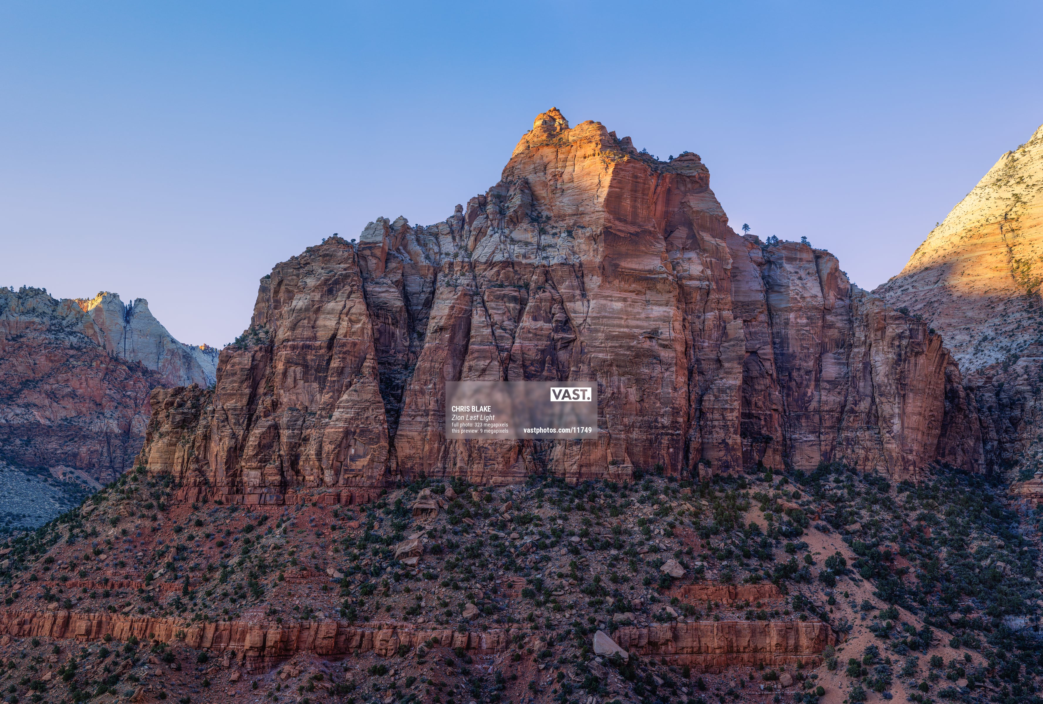 Mount Spry, a seemingly diminutive peak at 5,720 feet, rises proudly within the majestic confines of Zion National Park, crafted from the timeless Navajo Sandstone. In the fleeting moments of dusk, I seized the opportunity to capture its essence in this expansive photograph. As the day's final light waned and a cloudless sky loomed above, uncertainty loitered in my mind, casting doubt on the potential for a remarkable image.
