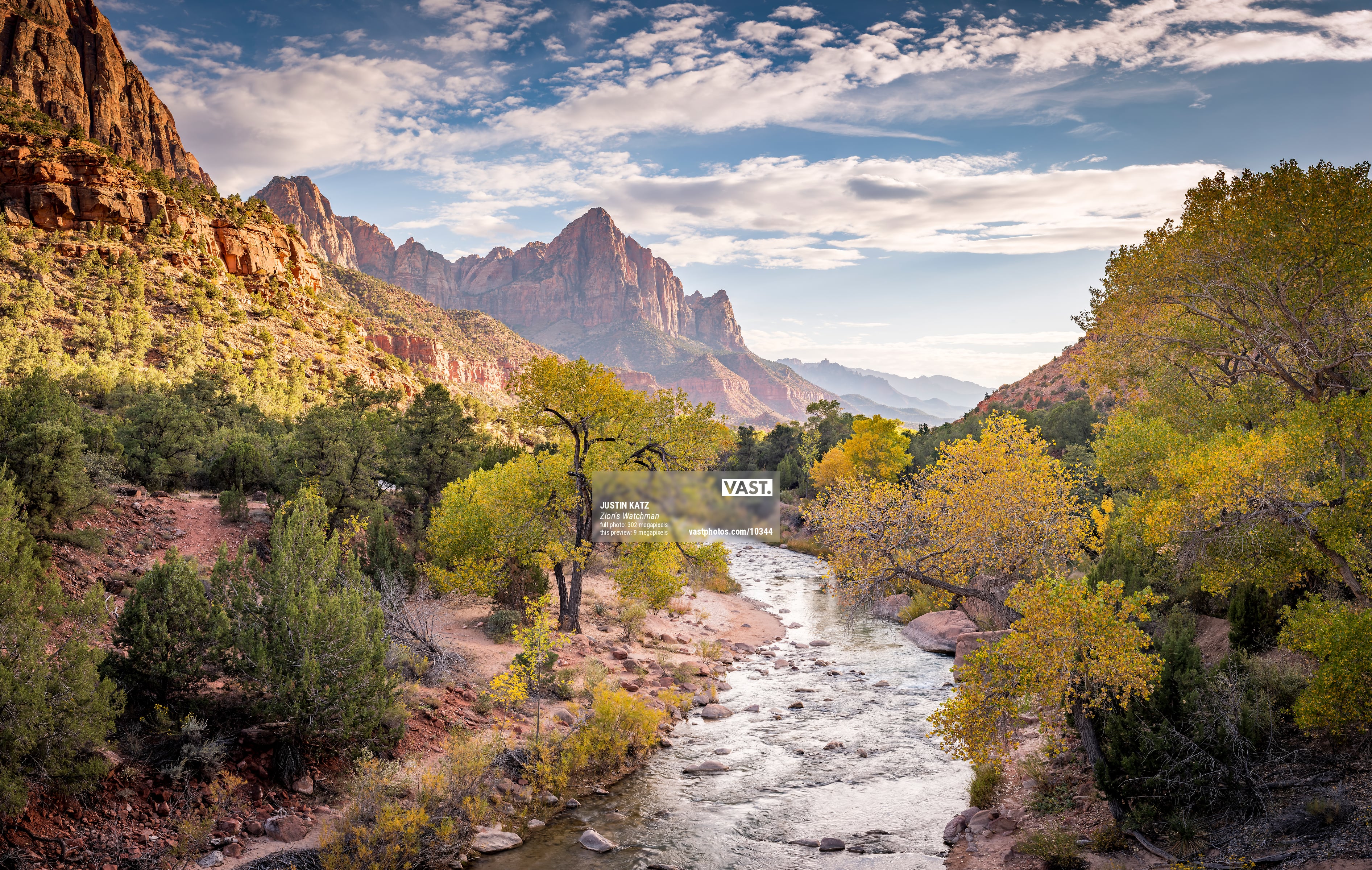 To capture this VAST photo of The Watchman required that I camp in the park for a while. It was a priority for me that the leaves be changing color in the fall and have just the right level of yellow to add that extra bit of color to the final image. I was very lucky that the sunset proved to be as magical as it did, adding texture and color to the sky.