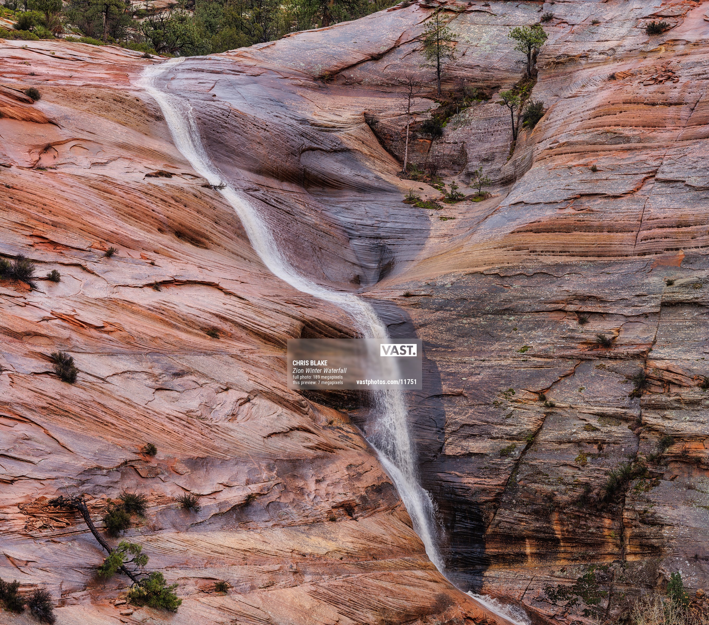 This image captures a fleeting moment on the east side of Zion National Park during a cold winters day, where rain and melting snow from higher elevations gave life to impromptu waterfalls, like the one featured here. The soft yet rugged textures of the slickrock canvas, painted in earthy reds and browns, guide the eye downward along the path carved by the rushing water. Trees and vegetation cling to the rock, adding contrast and life to the stark landscape. Taken in the park's backcountry, this scene highlights the power and beauty of nature's seasonal transformations.