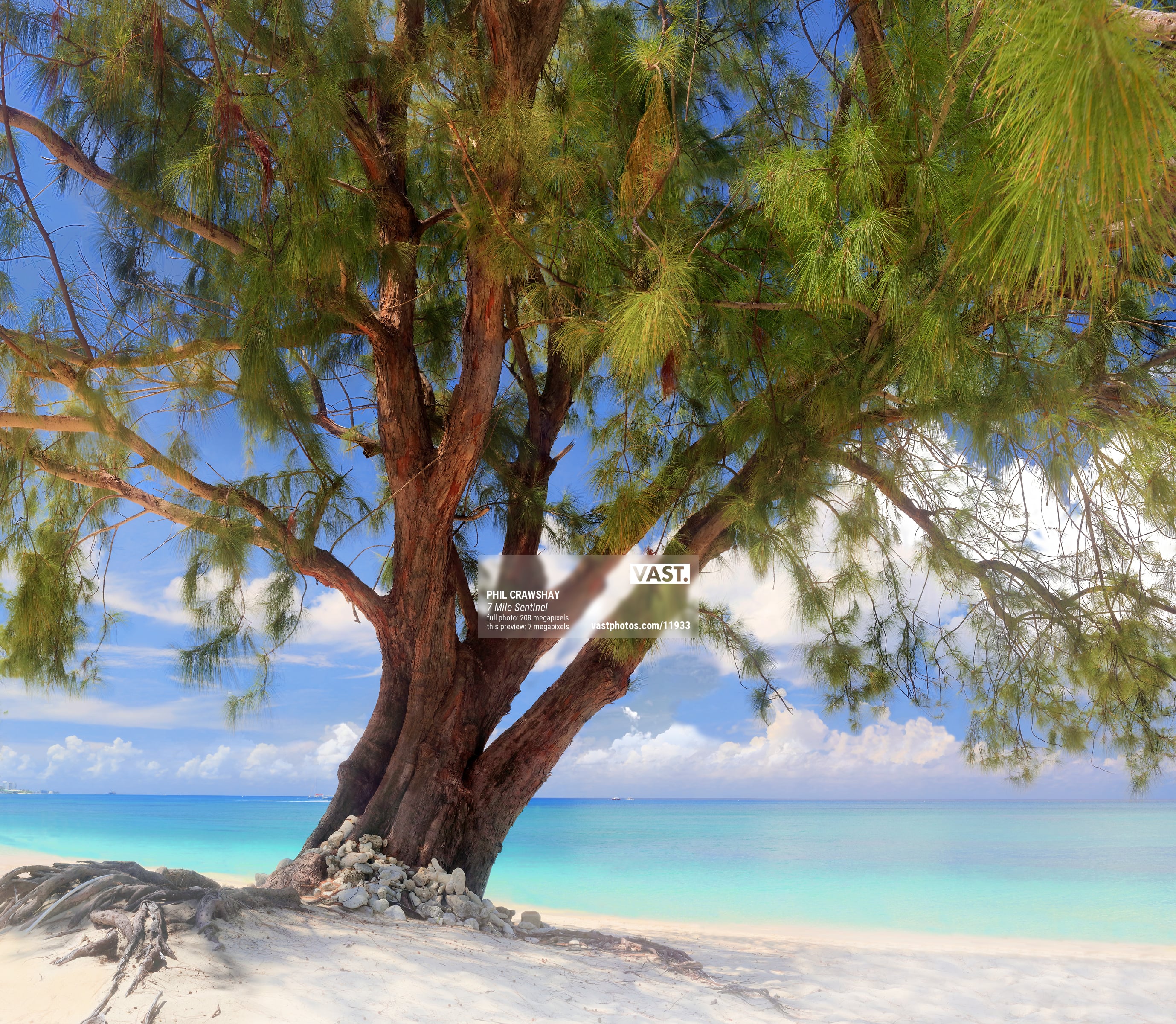 In this 210-megapixel photograph, the grand tree takes center stage, standing tall and proud against the backdrop of Seven Mile Beach's stunning turquoise waters. The sunlight filtering through its lush, green branches enhances the tree's rugged beauty, while the calm waters and white sand offer a serene contrast. This image invites viewers to admire the strength and resilience of nature, as the tree anchors itself in the soft sand, surrounded by the tranquility of the Caribbean.