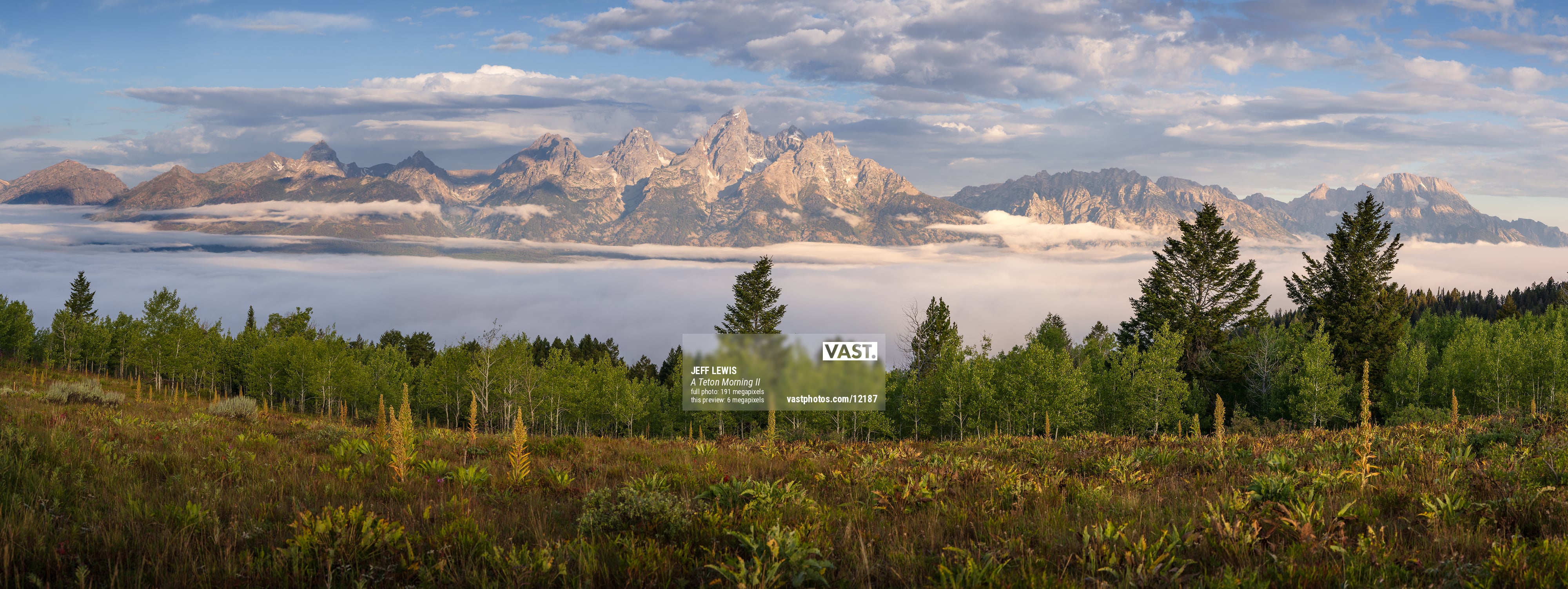 The scene was incredibly dynamic, with clouds drifting over the peaks and the fog changing colors. Thanks to the clear mountain air and sweeping views, I was able to capture five VAST photos over the course of a few hours, before heading back down the hill into the fog to start a 15-mile hike, which was also lovely! Over this trip, I hiked around 80 miles, which included a summit of Middle Teton, the second highest peak in the range and prominently visible in the center of this VAST photo. It was a long day, but one of the most rewarding summits I've stood on, and it made the photos from the trip much more special. I hope you're able to enjoy it as well!