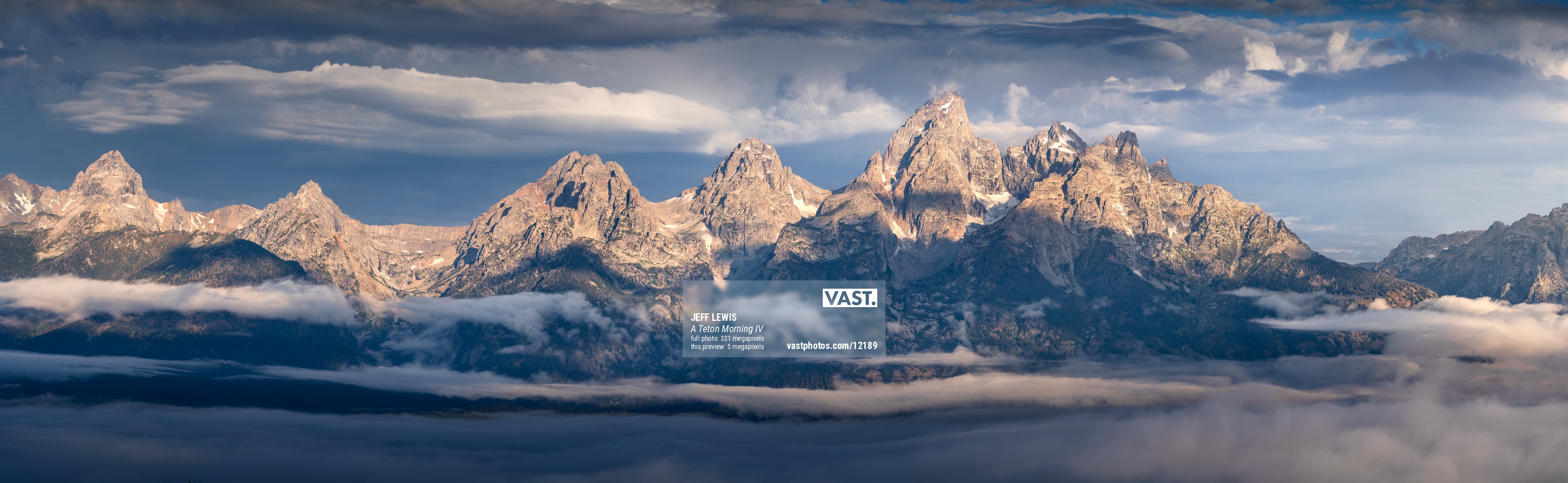 The scene was incredibly dynamic, with clouds drifting over the peaks and the fog changing colors. Thanks to the clear mountain air and sweeping views, I was able to capture five VAST photos over the course of a few hours, before heading back down the hill into the fog to start a 15-mile hike, which was also lovely! Over this trip, I hiked around 80 miles, which included a summit of Middle Teton, the second highest peak in the range and prominently visible in the center of this VAST photo. It was a long day, but one of the most rewarding summits I've stood on, and it made the photos from the trip much more special. I hope you're able to enjoy it as well!