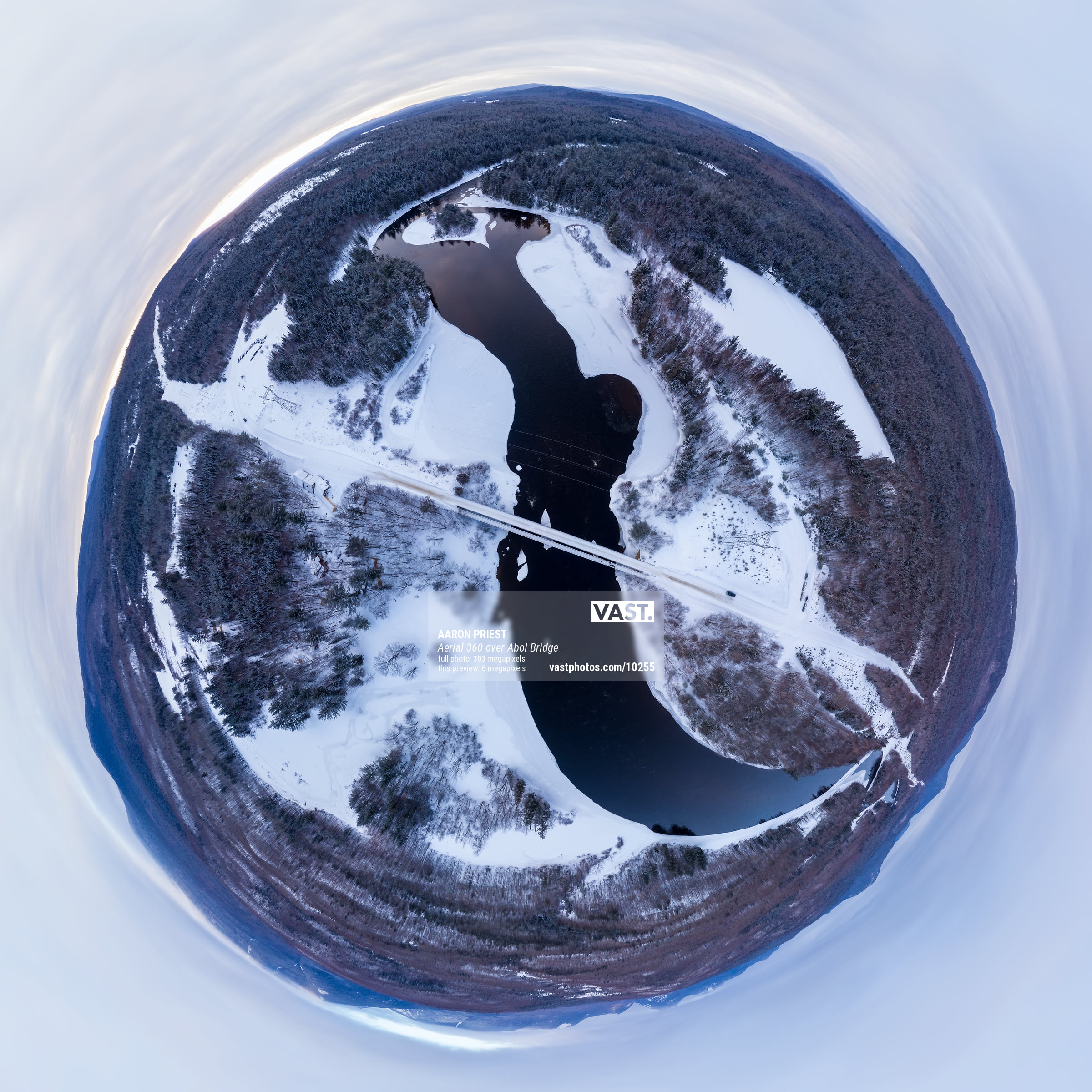 Clear aerial photography requires stable air to capture images sharp enough for a VAST photo. I waited out several days of bitter cold and wind for a calm enough morning to launch my drone and create this 360-degree panorama. Using a stereographic projection and pointing straight down to the ground in post-production digitally maps the sphere into a ball and gives the appearance of a little planet floating in clouds.