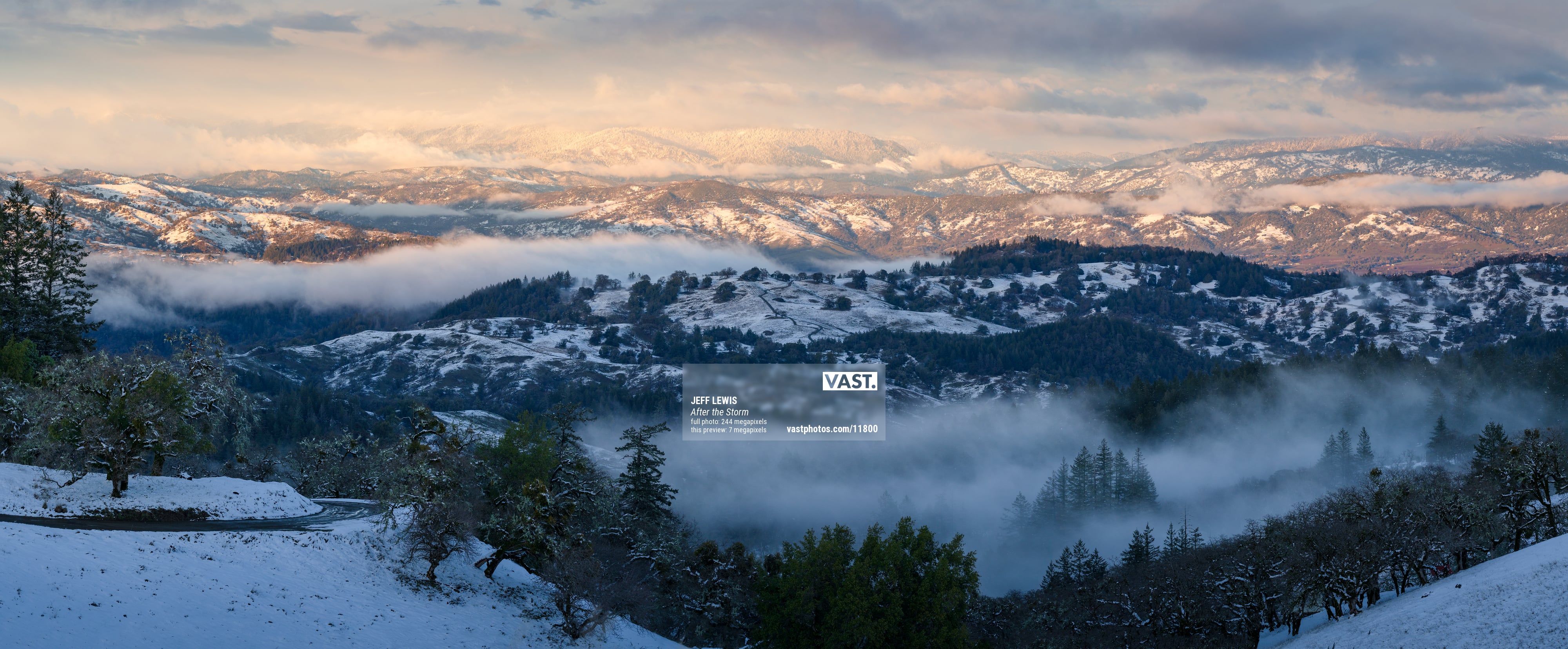 On rare occasions, snow dustings occur at low elevations in Northern California. I took this photo just as an extremely cold, powerful winter storm was clearing out of the area. The same storm produced snow down to 1000' in the San Francisco Bay Area, and several feet of snow that closed roads for days in the Lake Tahoe region. It was a very special opportunity to photograph a fleeting winter scene in an area that isn't known for it. I seized the opportunity and went for a drive, just following my instinct until I saw the snowy hills, and drove up into them. After photographing some snow-covered oak trees in the stormy cloak of winter, then hiking up a mountain the following morning to catch the clearing storm back home in Marin County, I came back up here the next evening to watch the storm clear. This is the scene I was greeted with. This is not a commonly photographed area, especially considering how beautiful it is!