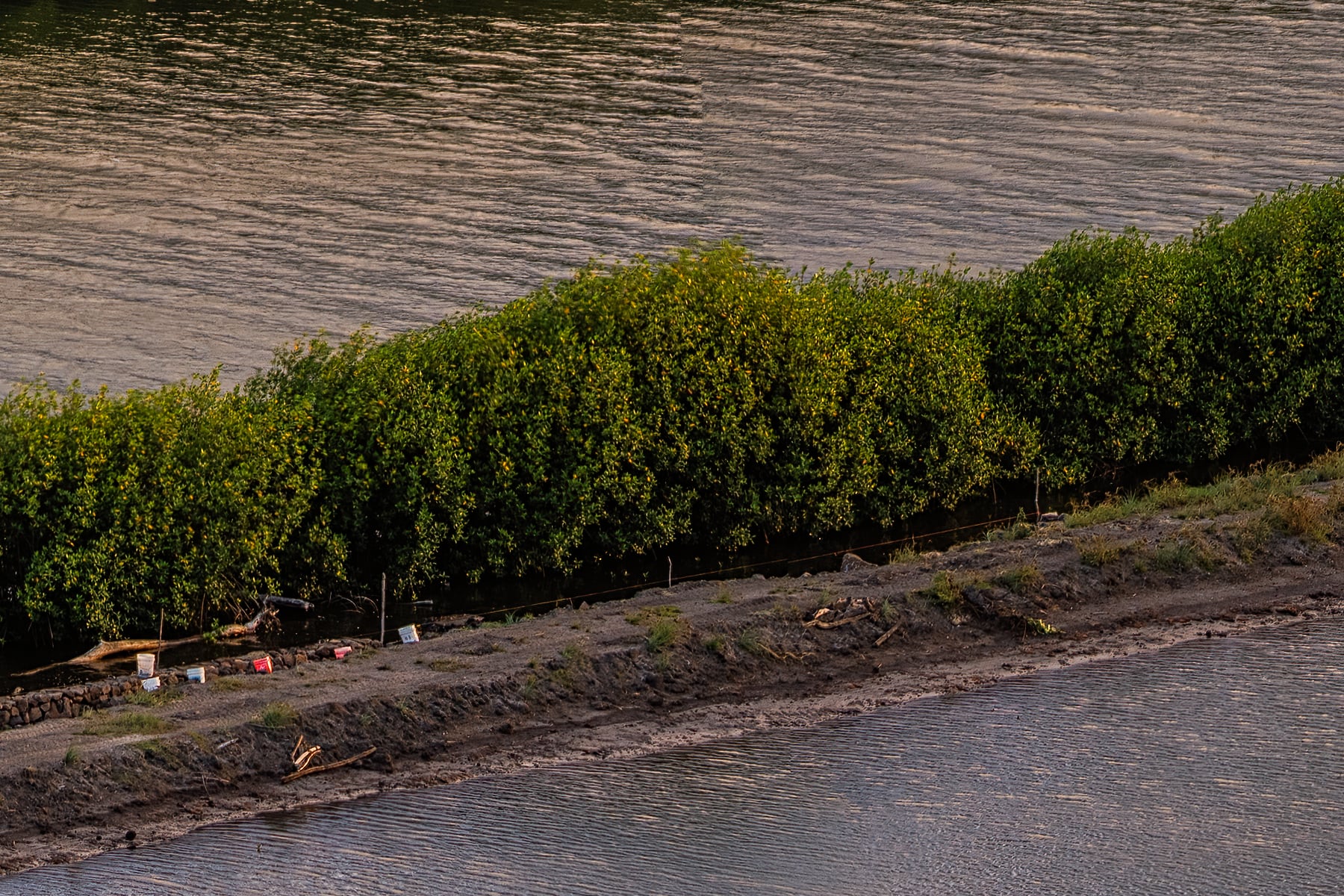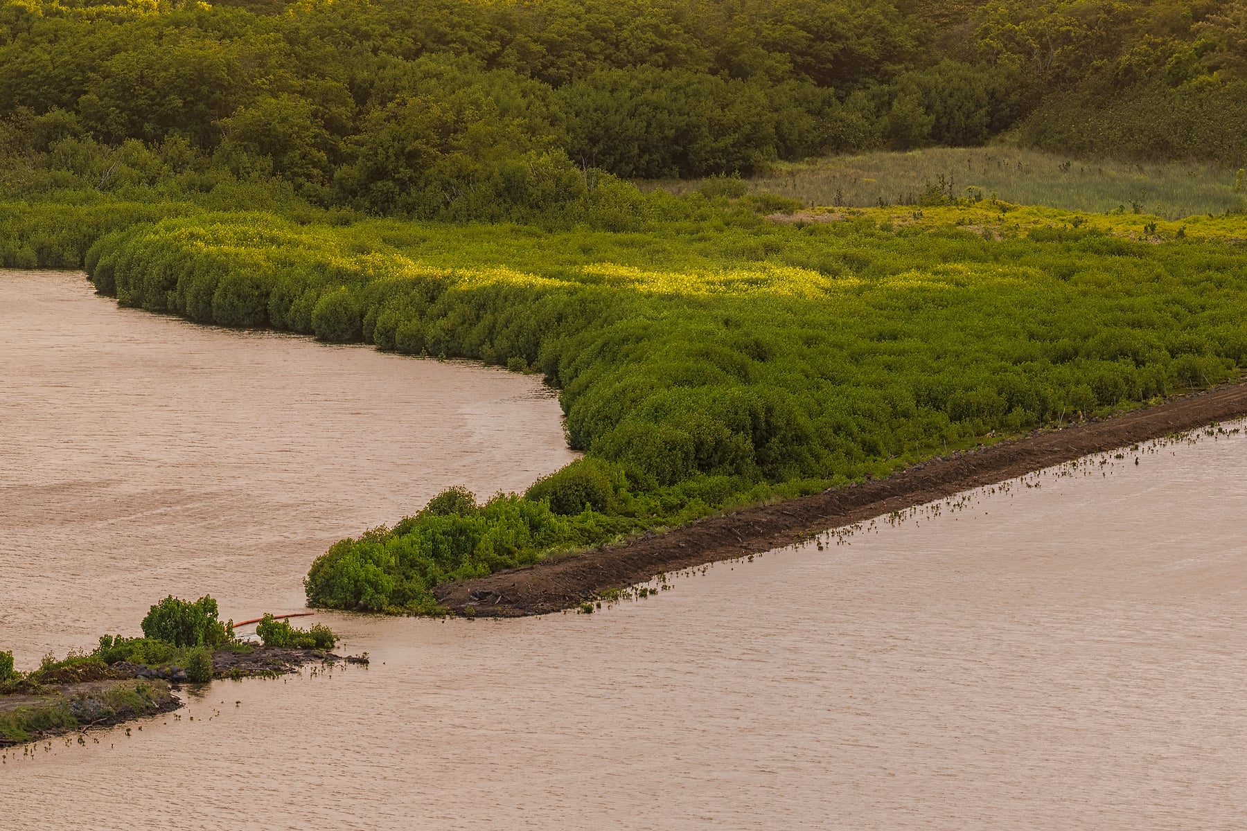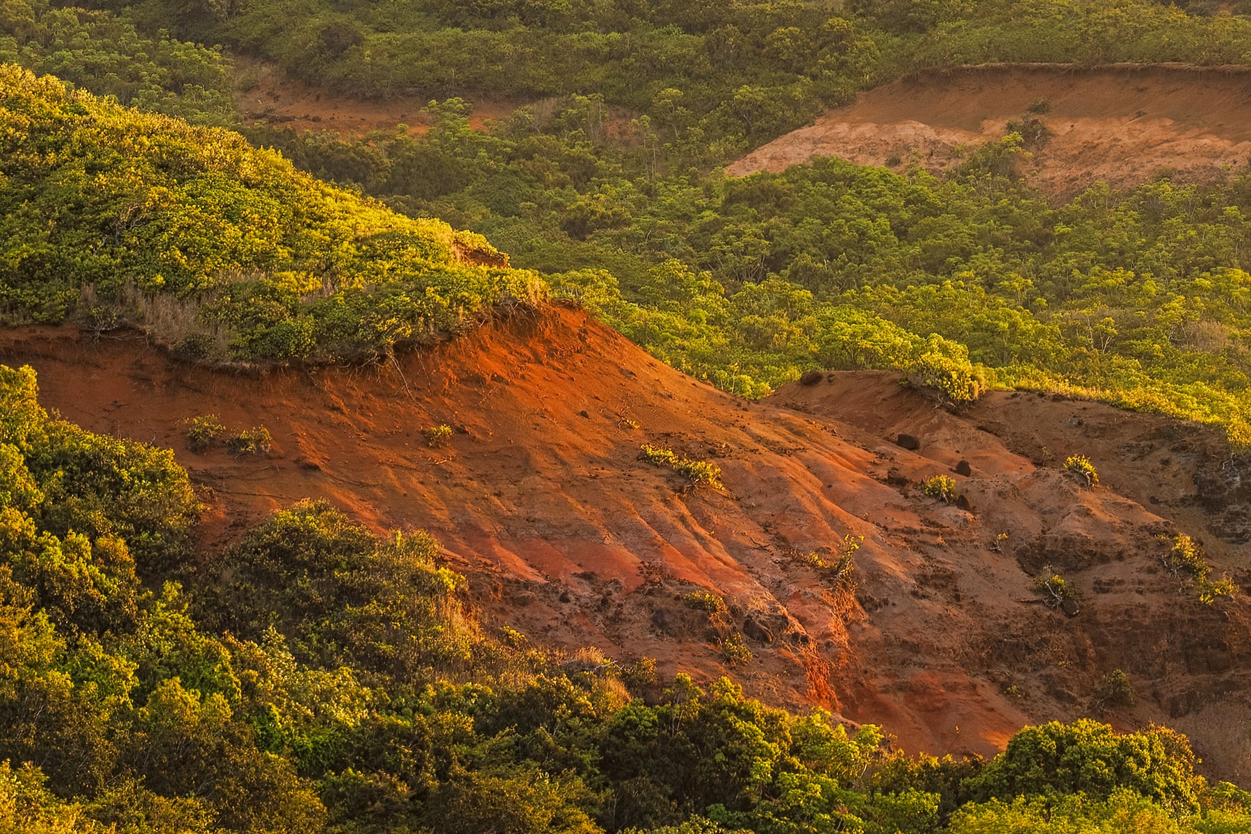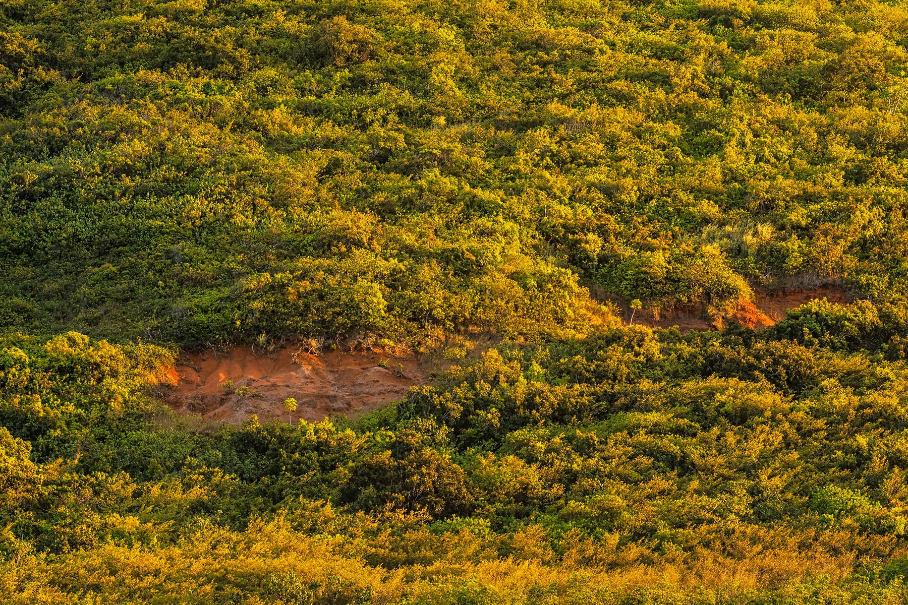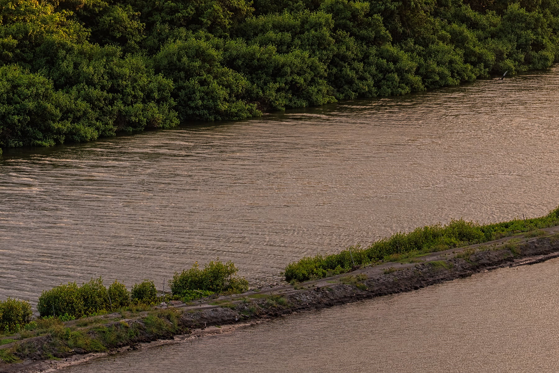 This photograph was taken earlier in the sunset hour, before the sky shifted into deeper evening tones. Warm golden light swept across the hillsides, illuminating the dense vegetation and revealing the red earth beneath. The light moved quickly, catching the contours of the valley while the fishpond and river remained calm below. The result is a scene defined by color and depth a moment when the landscape briefly glowed before the changing light softened into dusk.