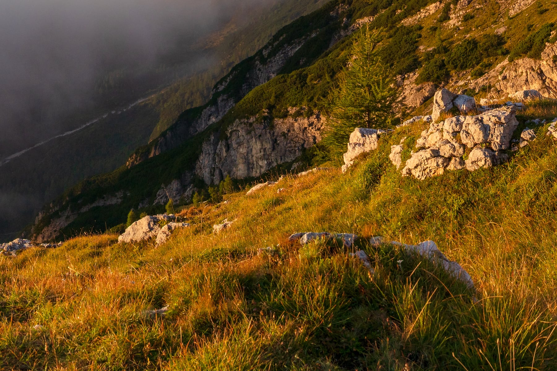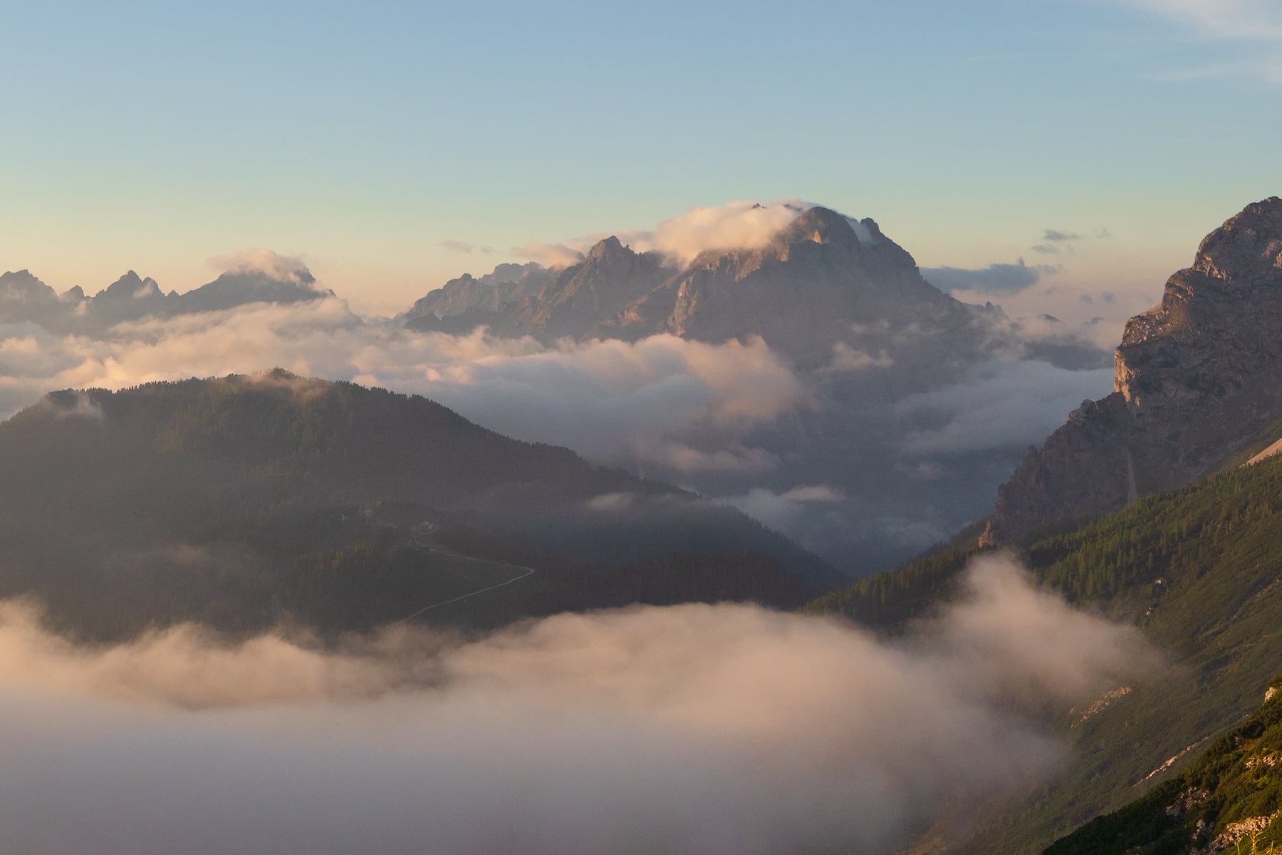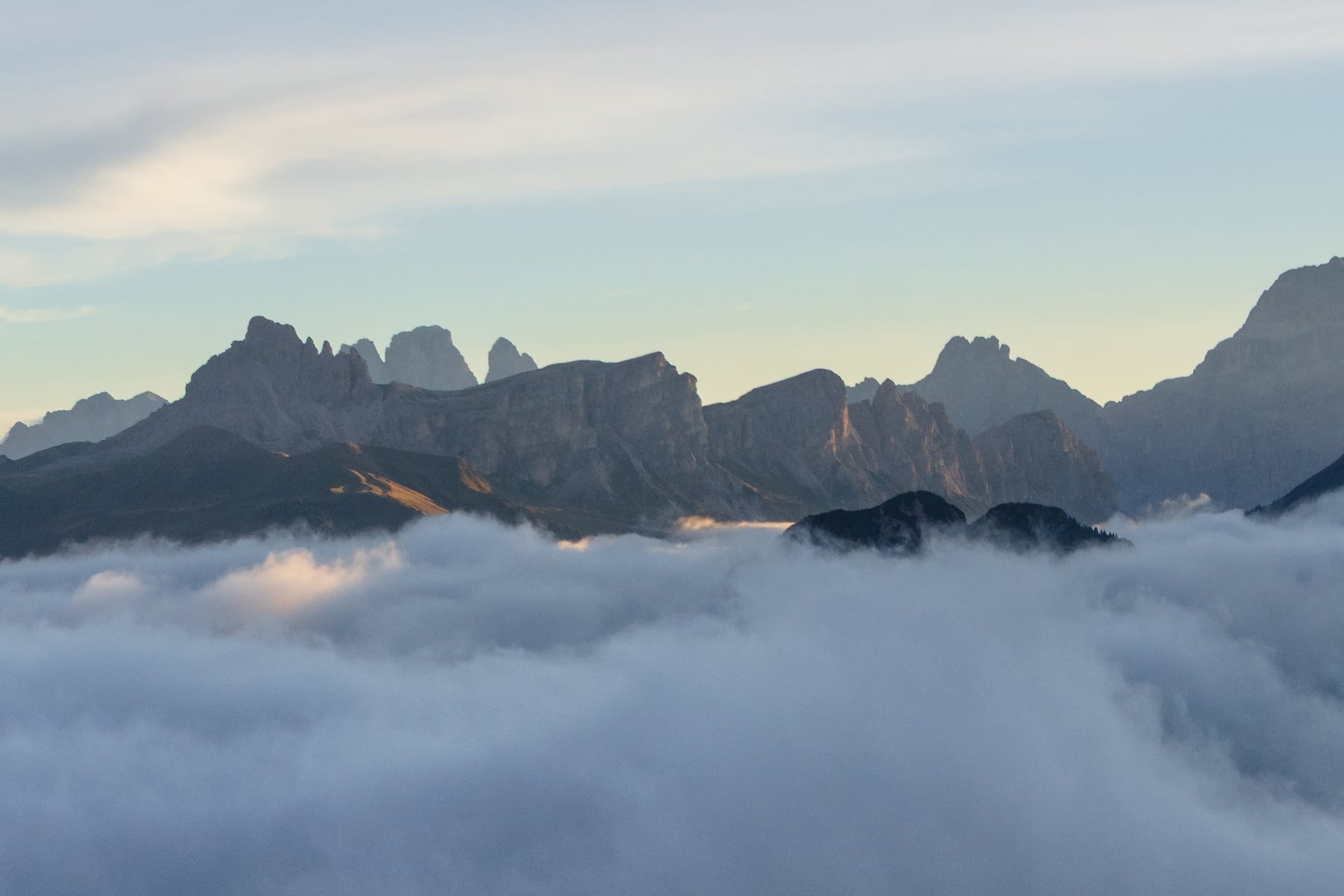 As a lush mountain region, the weather was everchanging and fickle -- there were times when we couldn't see any mountains for days at a time. But all storms break eventually, as long as you're patient! This is one of the photos I was able to capture on a lovely foggy morning, from one of my favorite rifigios that we were able to spend the night in. The fog was changing every moment, and the sunrise light brought everything together!