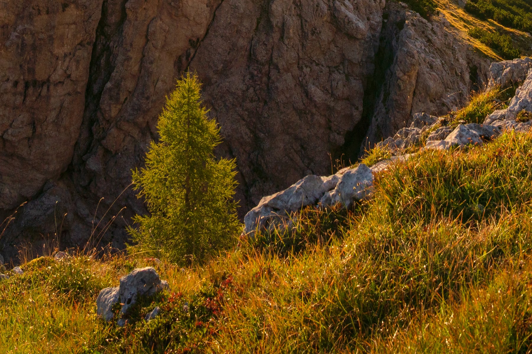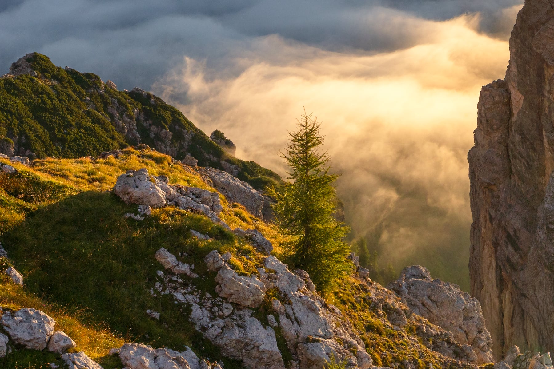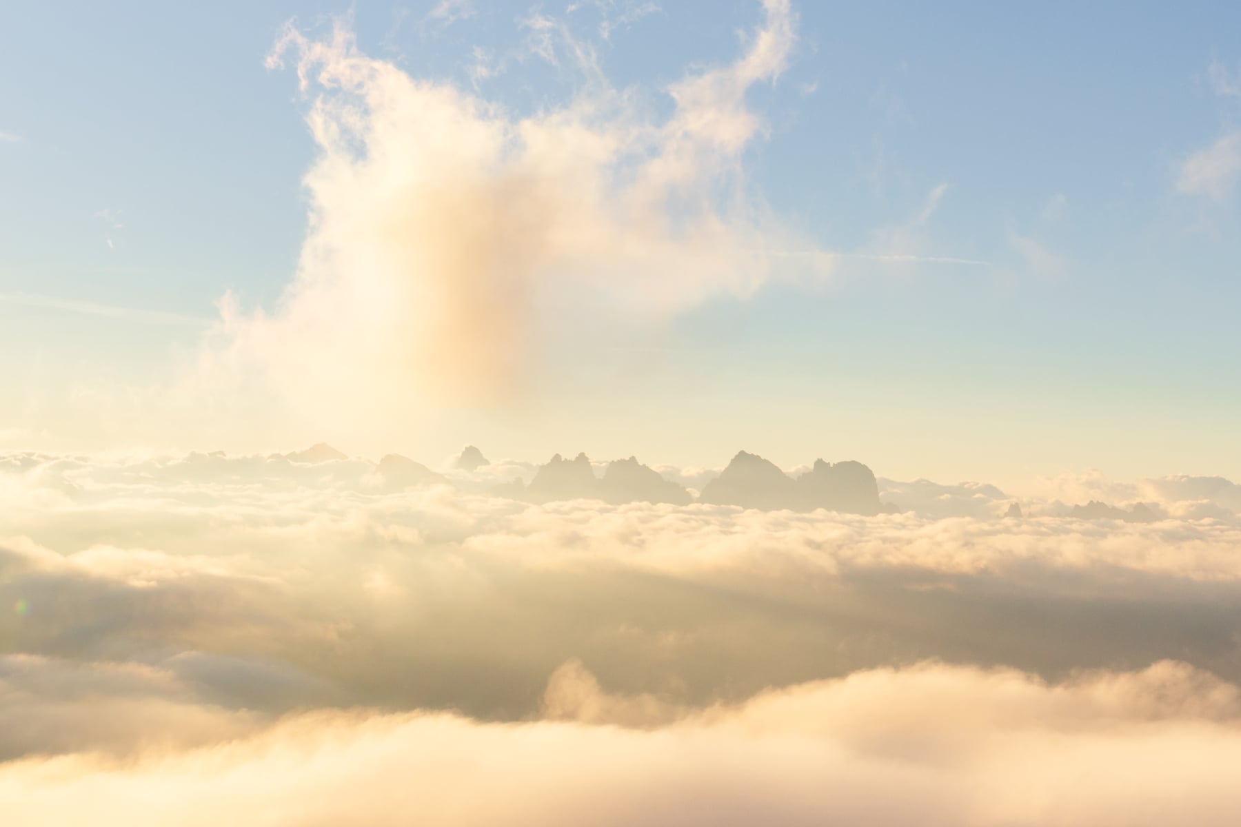 As a lush mountain region, the weather was everchanging and fickle -- there were times when we couldn't see any mountains for days at a time. But all storms break eventually, as long as you're patient! This is one of the photos I was able to capture on a lovely foggy morning, from one of my favorite rifigios that we were able to spend the night in. The fog was changing every moment, and the sunrise light brought everything together!