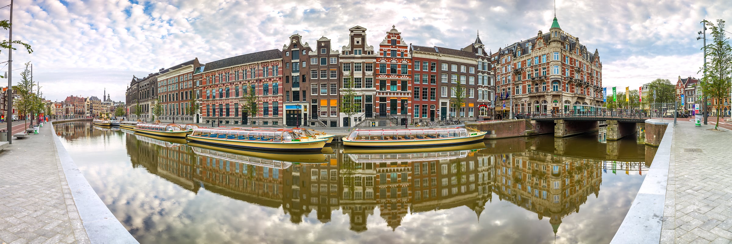 A stunning panoramic view of Amsterdam’s iconic canal scene, featuring traditional Dutch architecture, charming bridges, and scenic reflections in the tranquil waters. The historic buildings lining the canal exhibit classic Amsterdam facades with gabled rooftops, large windows, and a mix of vibrant and earthy tones. The still water perfectly mirrors the cityscape, enhancing the picturesque beauty of the scene.