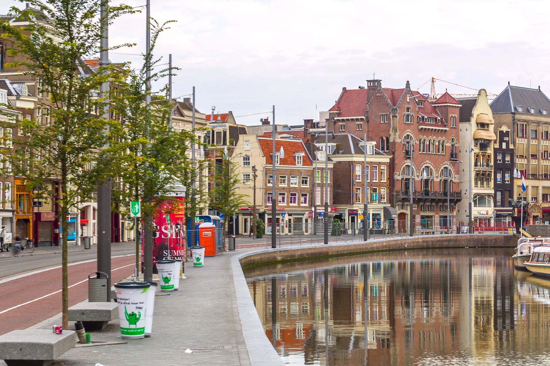 Elegant canal boats are moored along the edge, ready to take visitors on a tour of Amsterdam’s world-famous waterways. The bridge in the background connects the lively streets, showcasing the seamless blend of historic charm and modern city life. The cloudy sky adds texture to the composition, complementing the architectural details and the calm atmosphere.