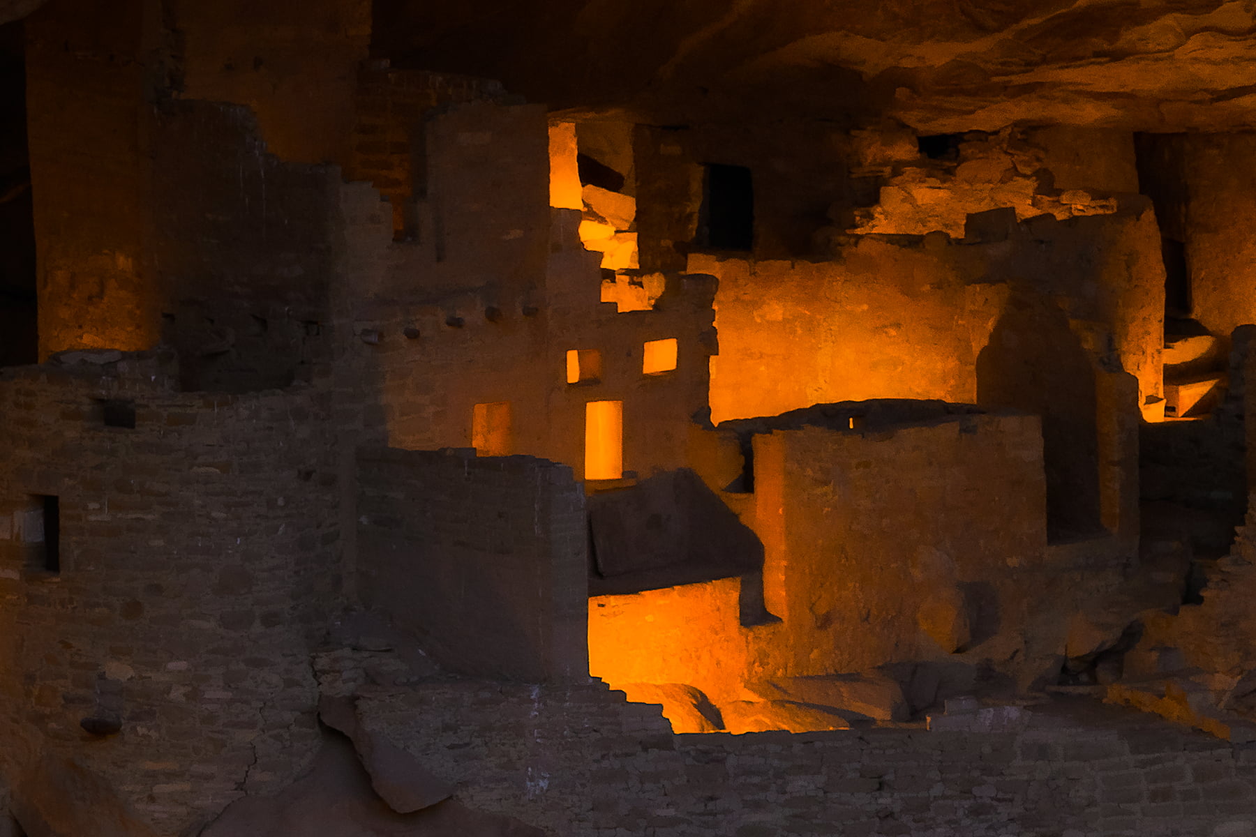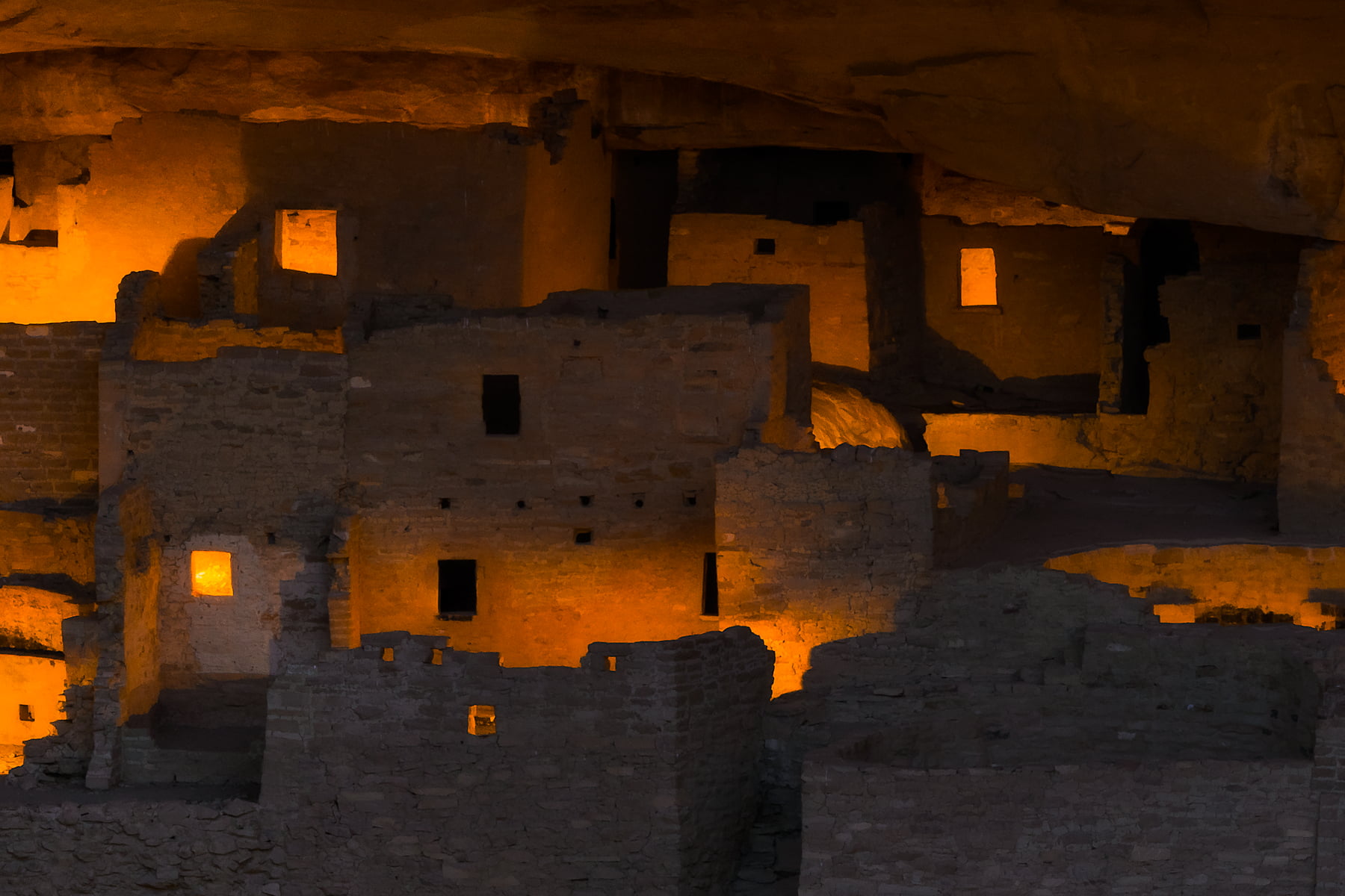 Cliff Palace is the largest cliff dwelling in North America. It was inhabited from 1190 to 1260 and contained 150 rooms and 23 kivas and had a population of approximately 100 people. Here the ruin is illuminated as part of the National Park Service Centennial. Mesa Verde National Park, Colorado.