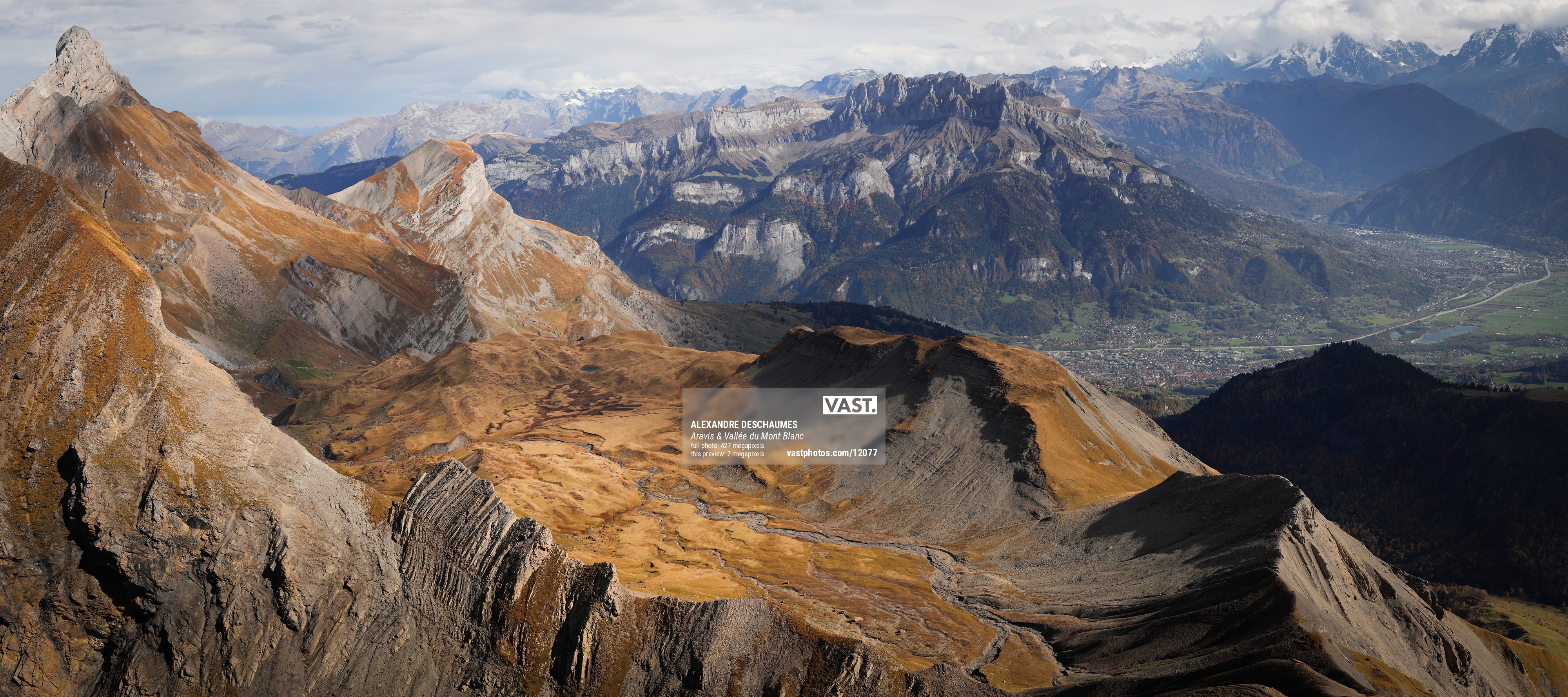 This panoramic photograph captures the breathtaking view from the Ambrevetta, in the Aravis range, overlooking the Arve Valley, Sallanches, the Passy Lake, and the towering Mont Blanc massif. In the foreground, the Combe des Fours unfolds with its intricate autumn meanders, drawing delicate lines across the golden high-altitude plateau.