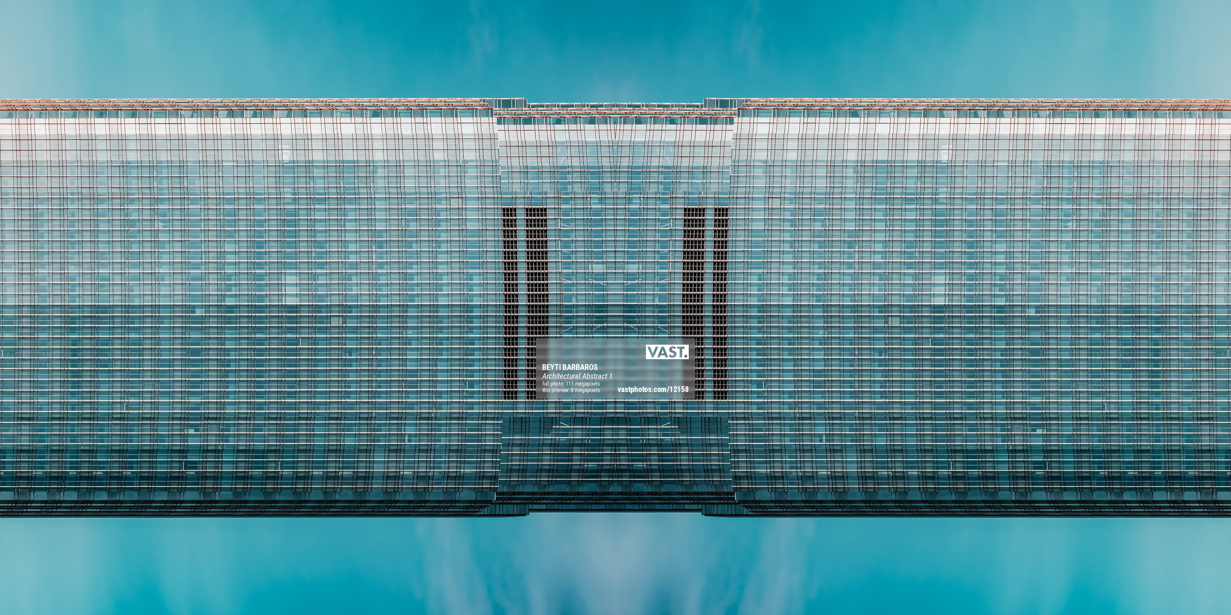 This striking architectural abstract photograph presents a mesmerizing study in symmetry, repetition, and modern design. The building's glass and steel facade becomes almost surreal through the mirroring effect, transforming the structure into a futuristic monolith suspended in a dreamlike teal sky. Grid lines run with machine-like precision across the surface, creating a rhythm that draws the eye toward the center, where vertical dark panels subtly anchor the composition. The clarity and minimalism of the color palette, dominated by cool blues and silvers, enhance the sense of calm order and sophistication. This image blurs the line between reality and abstraction, turning architecture into art.