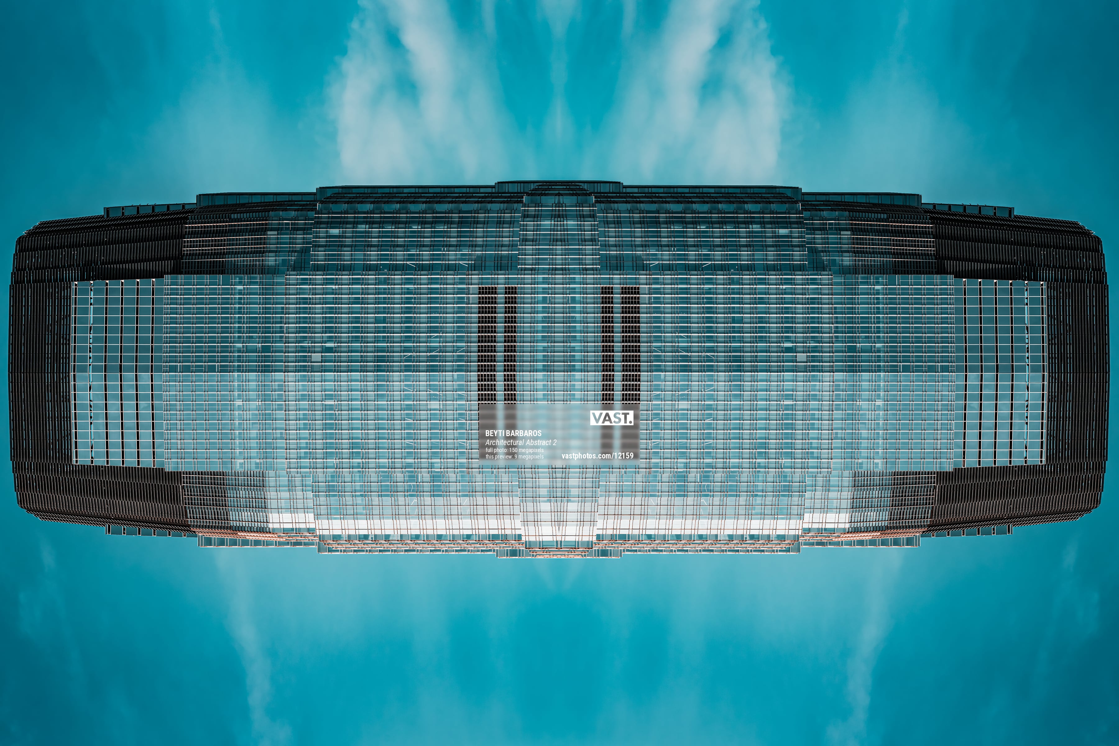 In this captivating architectural abstract, the mirrored composition transforms a modern building into an almost alien spacecraft hovering in a pristine teal sky. The precision of the horizontal and vertical lines creates a hypnotic grid that conveys both complexity and harmony. The symmetrical framing enhances the illusion, giving the structure a surreal, futuristic quality—its form reminiscent of a massive vessel or high-tech monolith. Subtle reflections and a soft gradient in the sky deepen the image’s visual impact, making it not just a photograph but a piece of conceptual art that challenges the viewer’s perception of space, structure, and design.