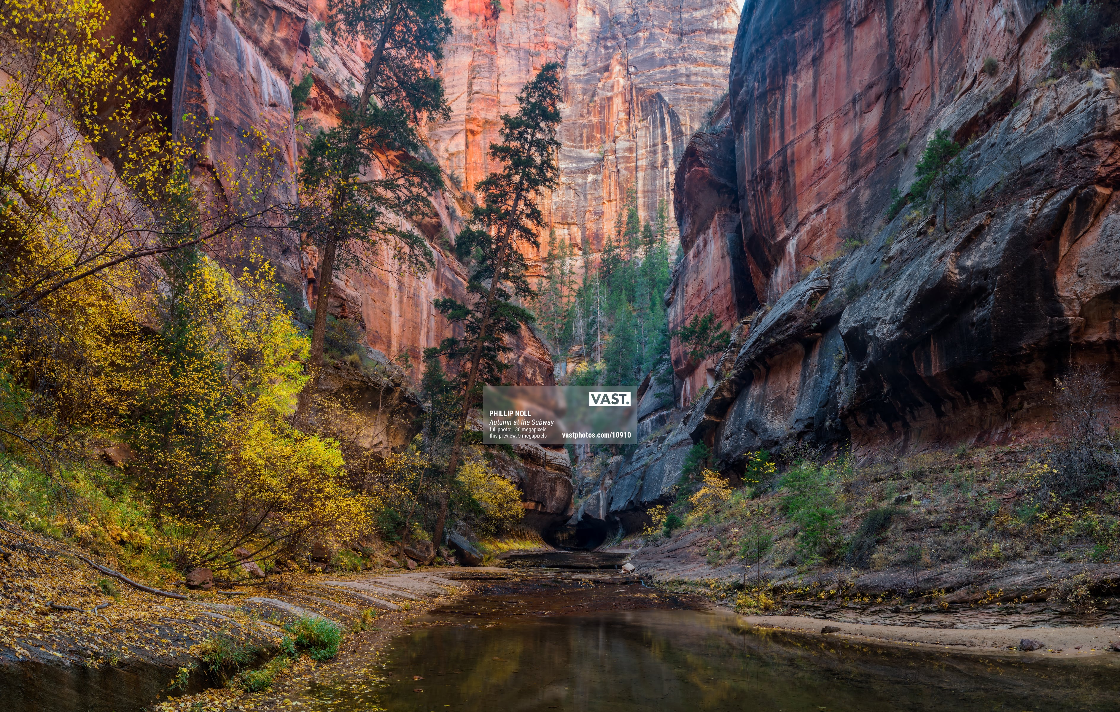Past blue-green pools filled with yellow leaves the Left Fork of North Creek flows through the Subway and on to several waterfalls in this remote part of Zion National Park, Utah. An incredible and special place that takes a bit of effort to reach!