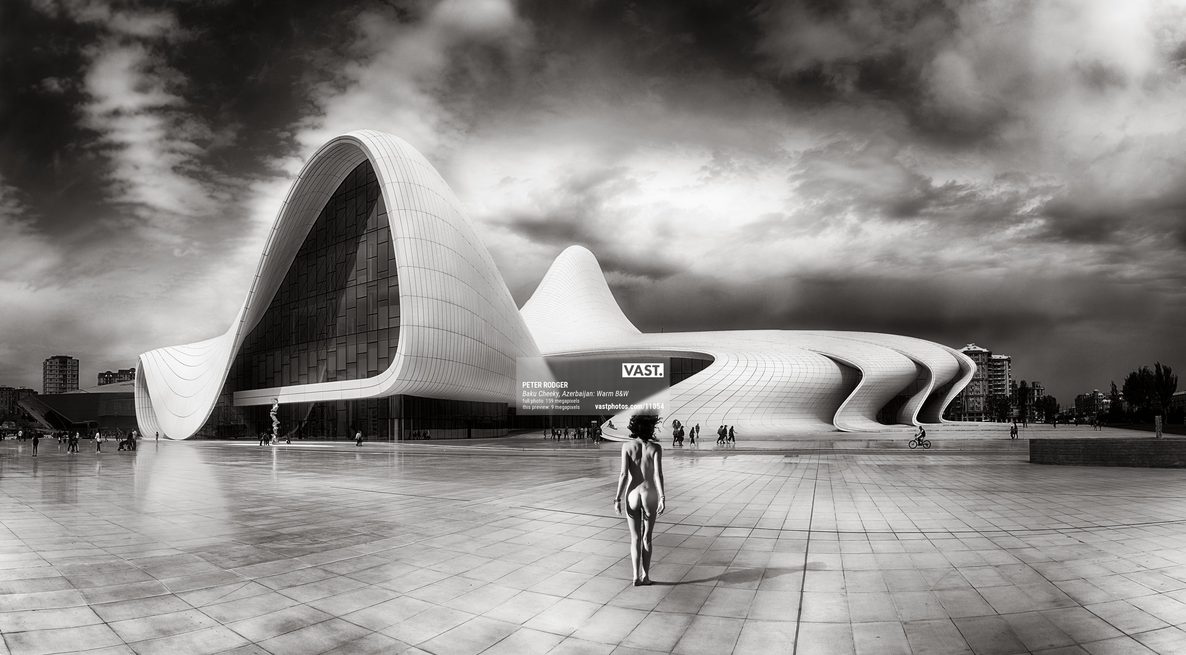 The inspiration for this image is really the amazing architecture of Zaha Hadid who was the architect of the building - The Heydar Aliyev Centre in Baku, Azerbaijan. The lines of the building inspired me to continue the cheeky series on a grand scale. The cheeky series has always explored the female nude and shapes mirrored in public and bucolic environments. The building is feminine and the lonely nude in front of it is to express the relationship to the amazing lines of the museum with a feminine form. Thank you Zaha Hadid. Your work lives on!