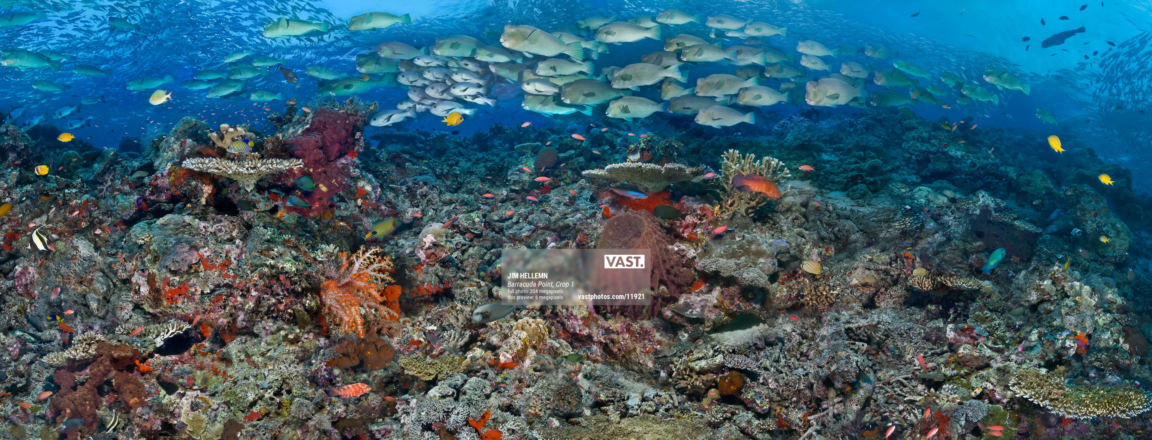 Bumphead Wrasse make their way across the reef in this high resolution image of a reef in Sipadan Island, Malaysia. This image is cropped from the right side of the master ”Barracuda Point” image. Each morning at dawn, the Bumpheads gather at the top of the reef after spending the night tucked into crevices in the deep reef walls. Once the whole group is assembled, they make their way across the reef and into the shallows to feed.