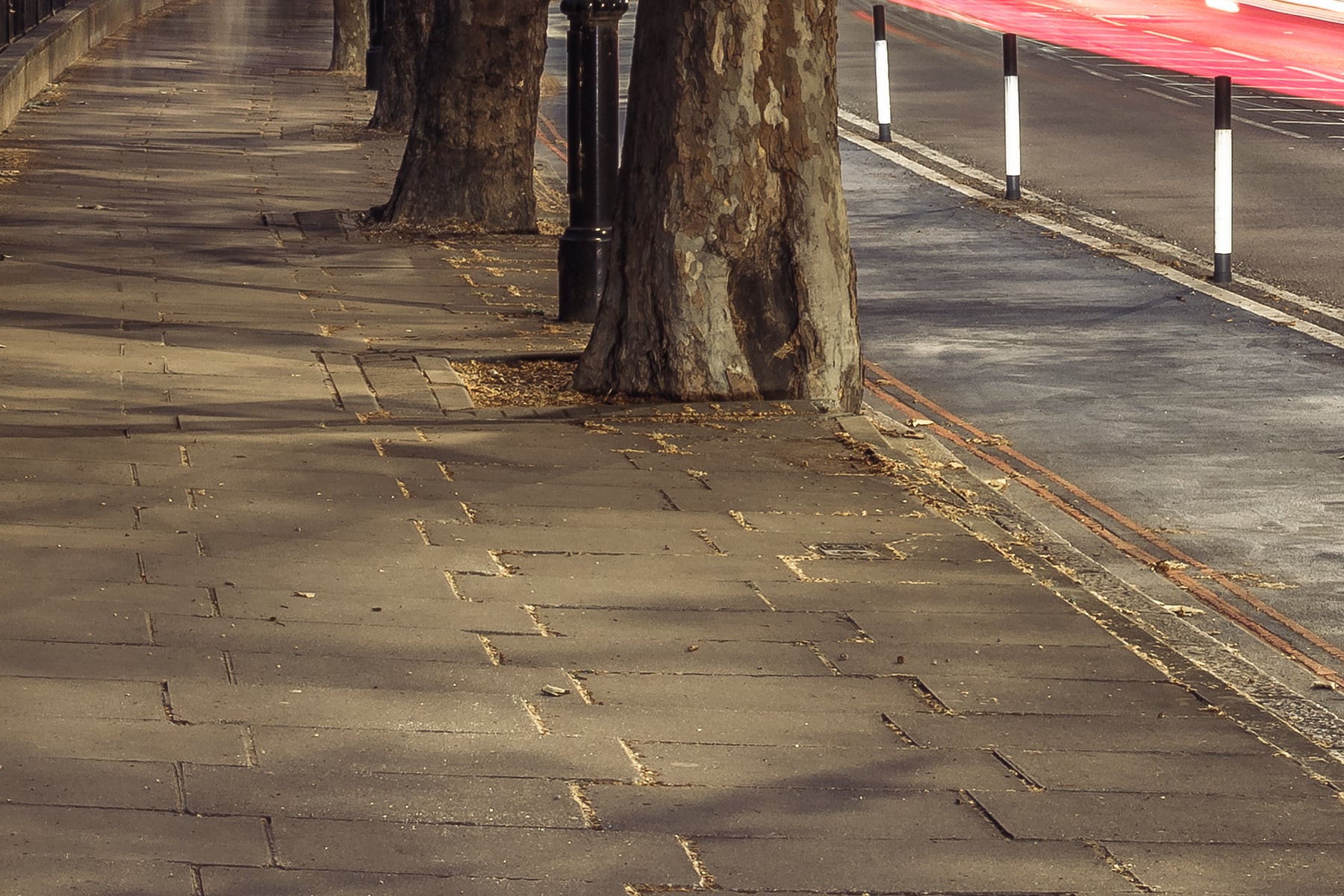 On the right side of the image, a tree-lined walkway runs alongside the river, bathed in the warm glow of streetlights. The light trails from passing vehicles add a dynamic contrast to the otherwise tranquil scene. The deep blue sky transitioning into night creates a serene backdrop, making this image a perfect representation of London’s architectural charm and urban life.