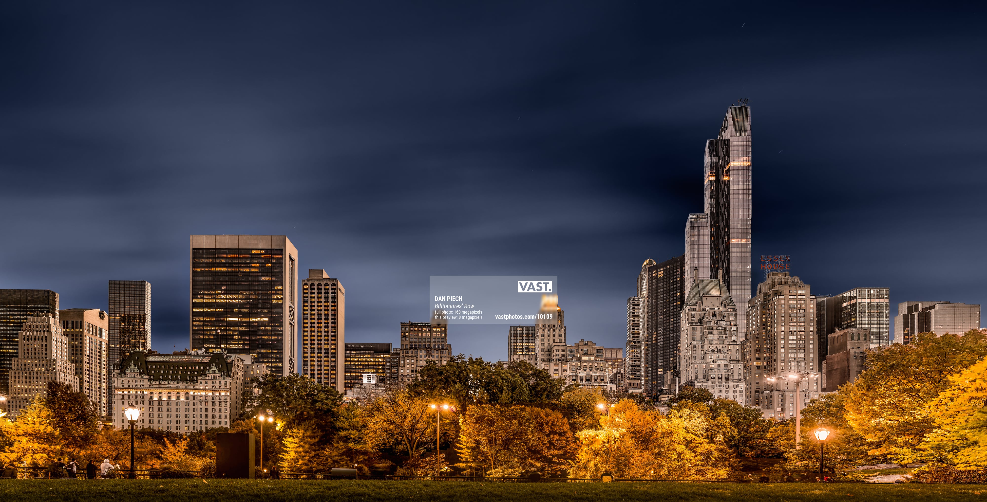 I set out on an autumn evening to capture the skyline of Billionaires' Row from Central Park, amid the warm glow of fall foliage illuminated by the park's streetlights. Low-hanging clouds were rapidly streaking across the sky, which led to a very pleasing backdrop when long-exposure shutter speeds were used. The warmth and sharpness of the autumn foliage provided a nice contrast to the cooler hues and subtly of the sky. Between these two elements were hundreds of the most expensive homes in the world and so the large-format technique seemed fitting to capture the most intimate of details them all.