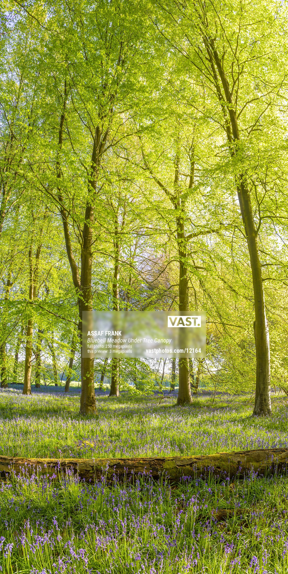 The composition highlights the vertical grandeur of the trees, emphasizing their elegant form and height. Sunlight trickles through the fresh foliage, creating intricate patterns of light and shadow that dance across the carpet of bluebells below. The vertical perspective provides a sense of immersion, as if the viewer is standing amidst the forest, soaking in the sights, sounds, and scents of a peaceful spring morning.