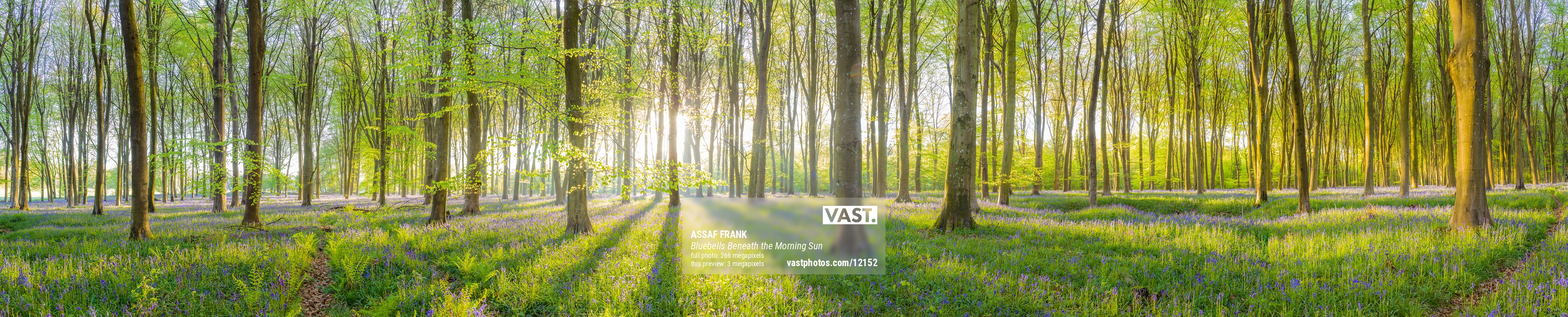 The image beautifully captures the tranquil essence of a spring morning in a Hampshire forest, where the ground is carpeted with vibrant bluebells. As the sun begins to rise, its golden rays filter through the tall, slender trees, casting long shadows and illuminating the forest in a warm, ethereal light. The scene evokes a sense of serenity and natural wonder, with the fresh green foliage and vivid purples of the bluebells creating a harmonious color palette.