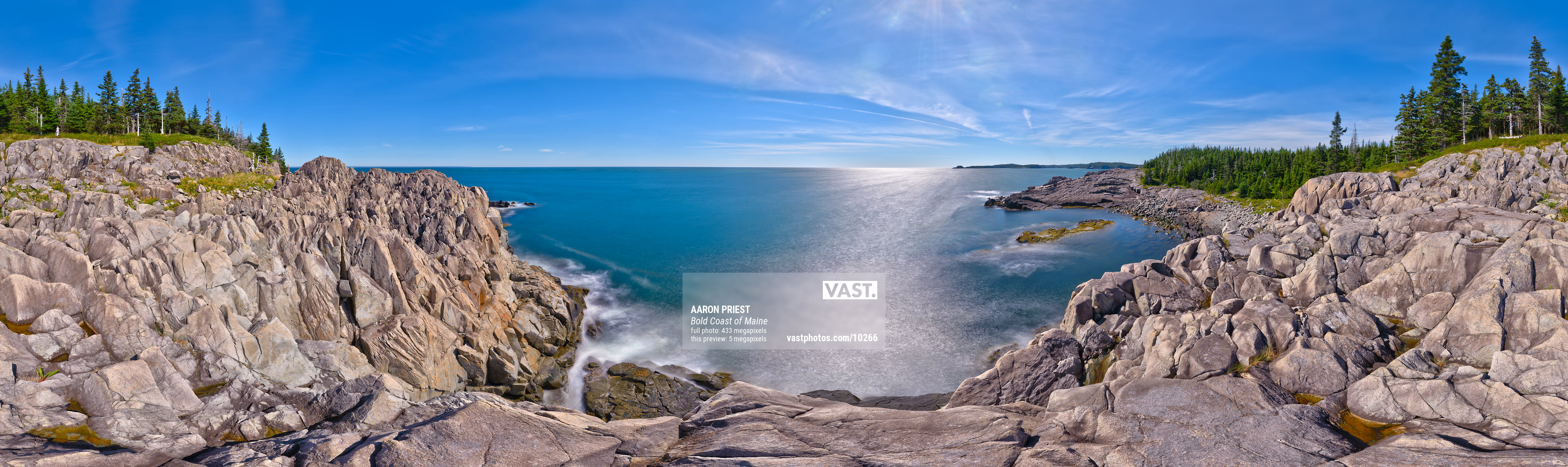 This is a crop of a 360° spherical panorama of Maine’s Bold Coast between Cutler and Lubec on September 6, 2013, 12:52 – 14:08. I used a 10-stop neutral density filter at f/22 to get long 30 second shutter speeds during the day of the ocean’s surf on the rocks. It was incredibly windy so I wasn’t sure if it would come out at all when I shot it. It took an hour and sixteen minutes at 50mm to capture all of the images with a Panoneed robotic head and Promote Control. The Panoneed has gyroscopes and a vibration sensor to only take photos when it is still, and on a Really Right Stuff TVC-34L tripod and leveling base it is very stable and vibration resistant.