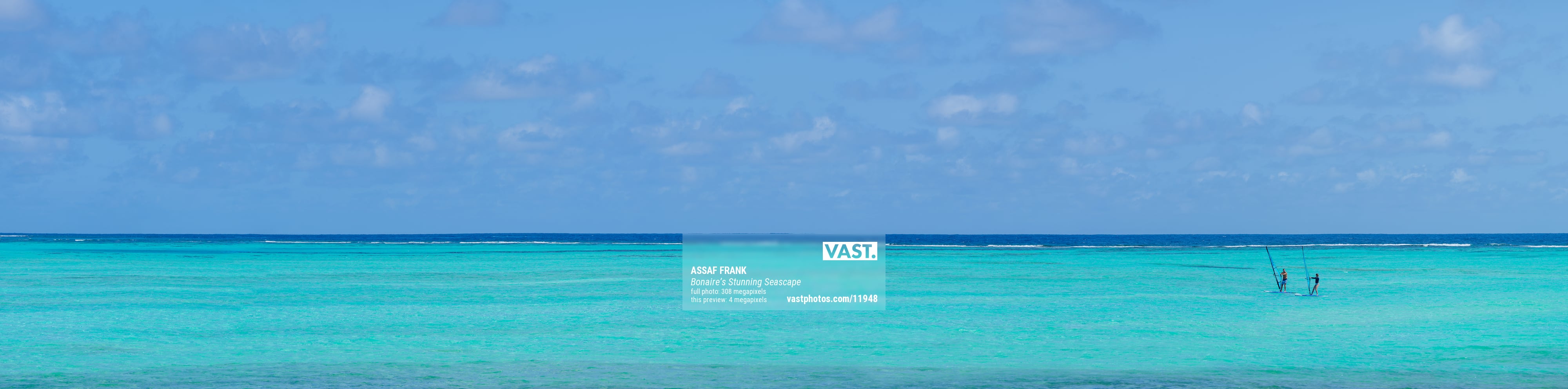 This breathtaking image captures the mesmerizing turquoise waters of the Bonaire Sea in the Caribbean Netherlands. The vast expanse of tranquil, crystal-clear water defines the scene, transitioning from light aqua hues near the shore to deeper blues as it stretches toward the horizon. The gentle waves and pristine conditions make this a perfect location for water sports and leisurely activities. In the distance, two windsurfers can be seen enjoying the calm waters, adding a sense of peaceful adventure to the picturesque seascape.