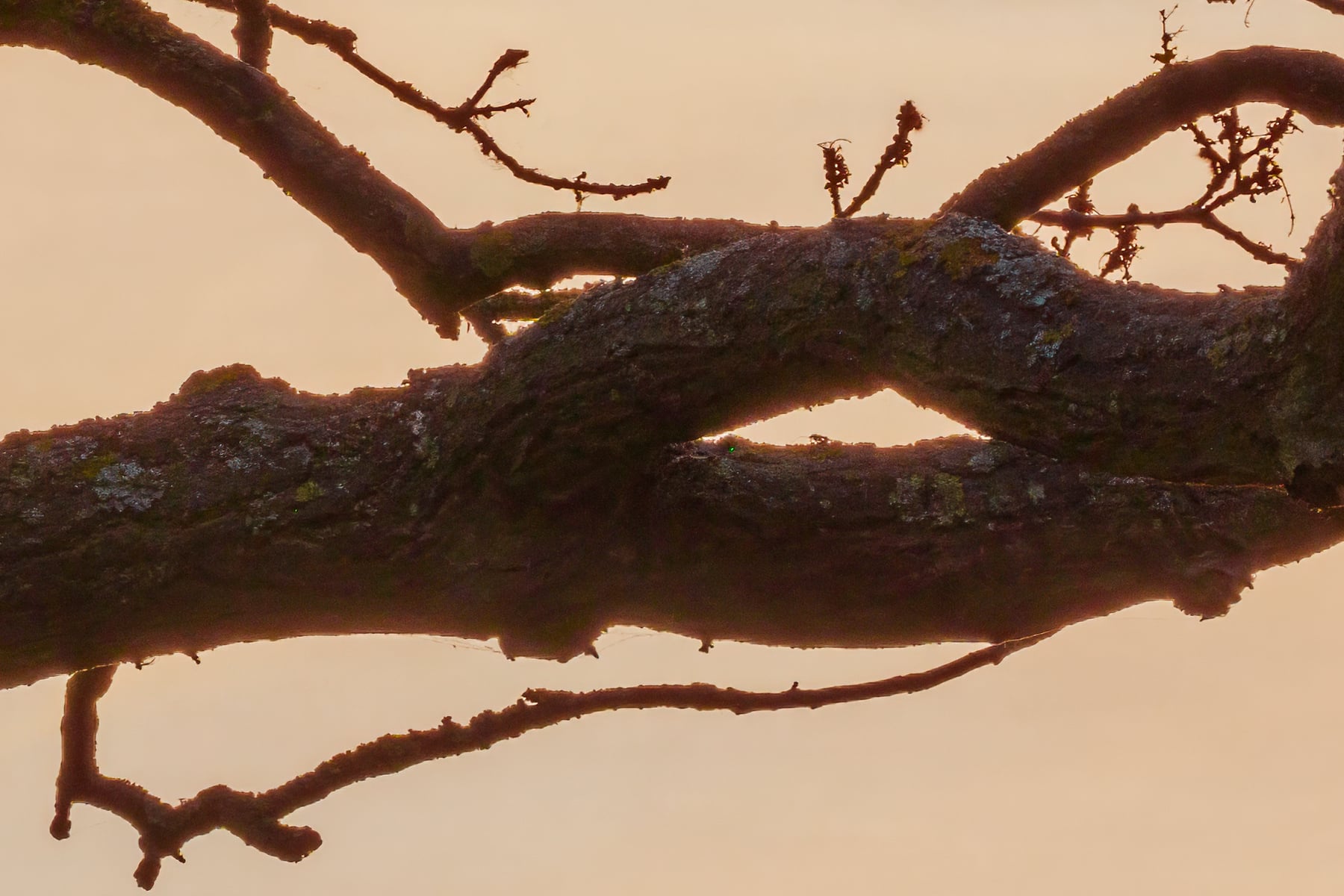 The sky itself, painted in shades of orange, pink, and blue, provides a dramatic yet soothing backdrop. The fading sunlight creates a gentle glow, illuminating the horizon as day gives way to night. There is a palpable sense of calm in the scene, as if time has momentarily paused to allow the viewer to fully absorb the beauty of the natural world. The intricate branches serve as a reminder of the passage of seasons, while the warm colors of the sunset evoke feelings of warmth and peace.