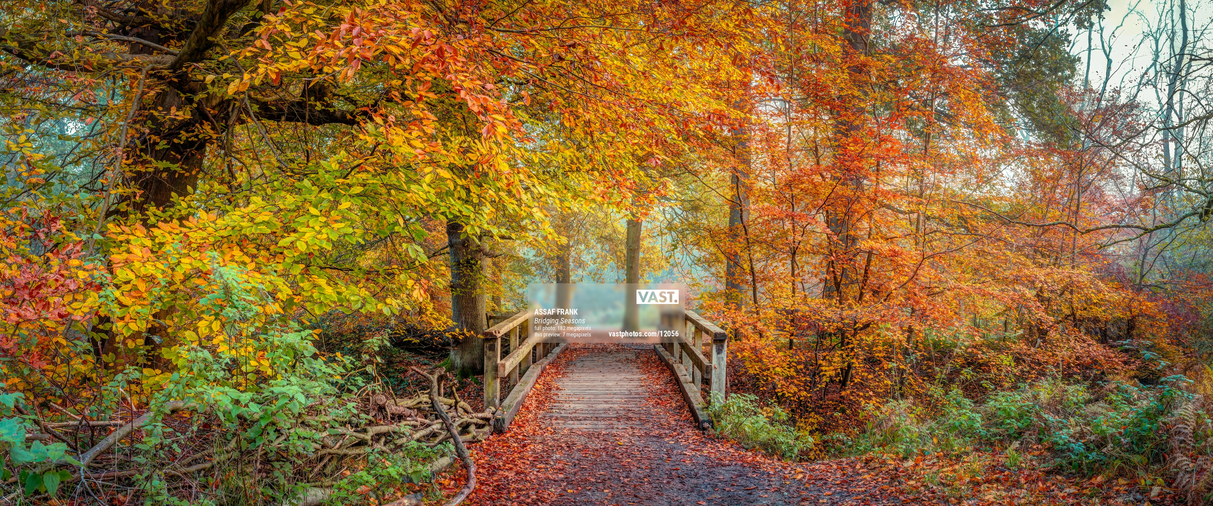A charming wooden bridge nestled in the heart of an autumn forest creates a picturesque and inviting scene. The canopy above is a stunning blend of golden yellows, deep oranges, and fiery reds, forming a natural tunnel of vibrant foliage. Fallen leaves gently carpet the pathway leading to the bridge, enhancing the warmth and richness of the season. The soft, diffused light filters through the trees, casting a magical glow on the rustic wooden railings, while the forest beyond fades into a peaceful mist, adding depth and intrigue to the setting.