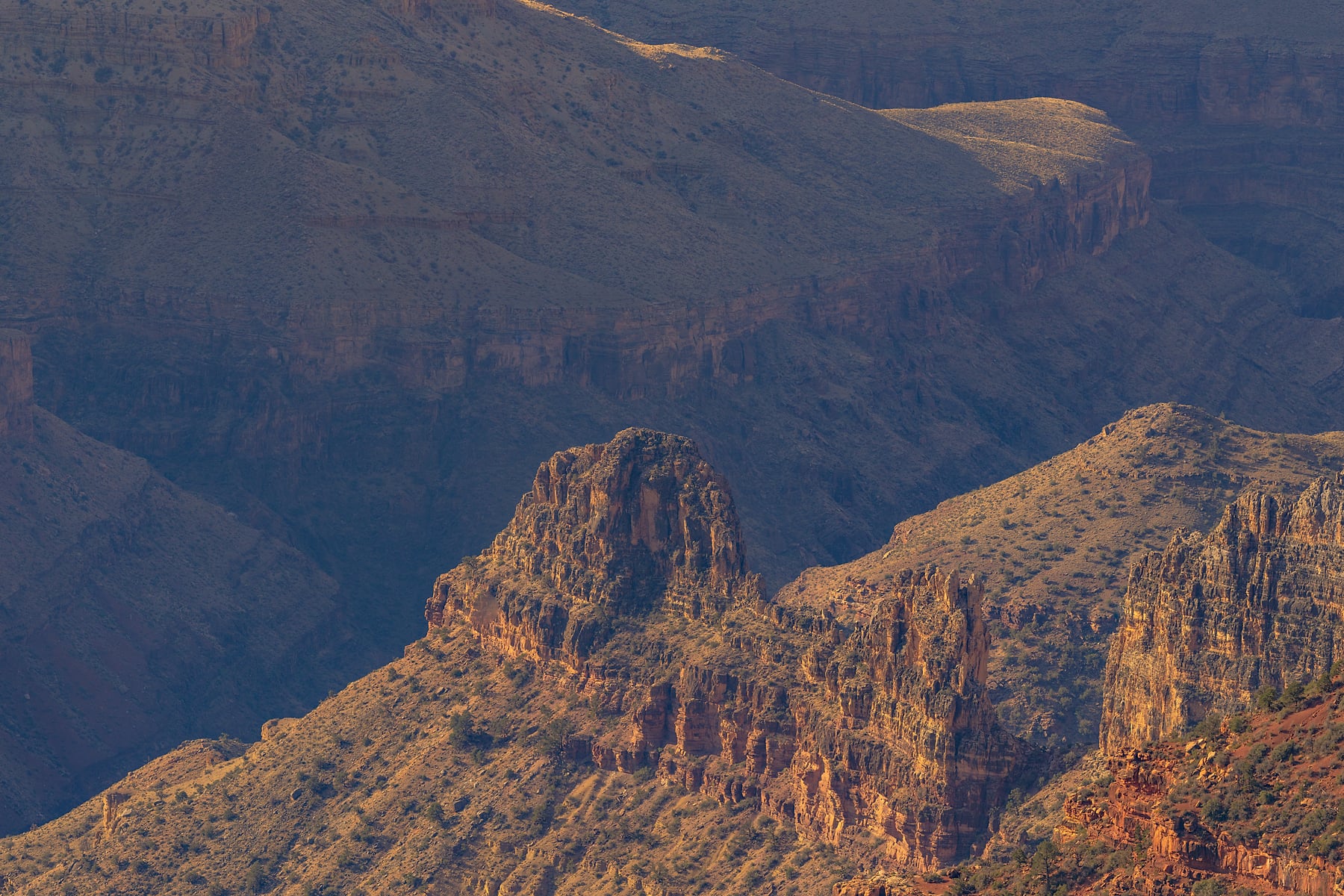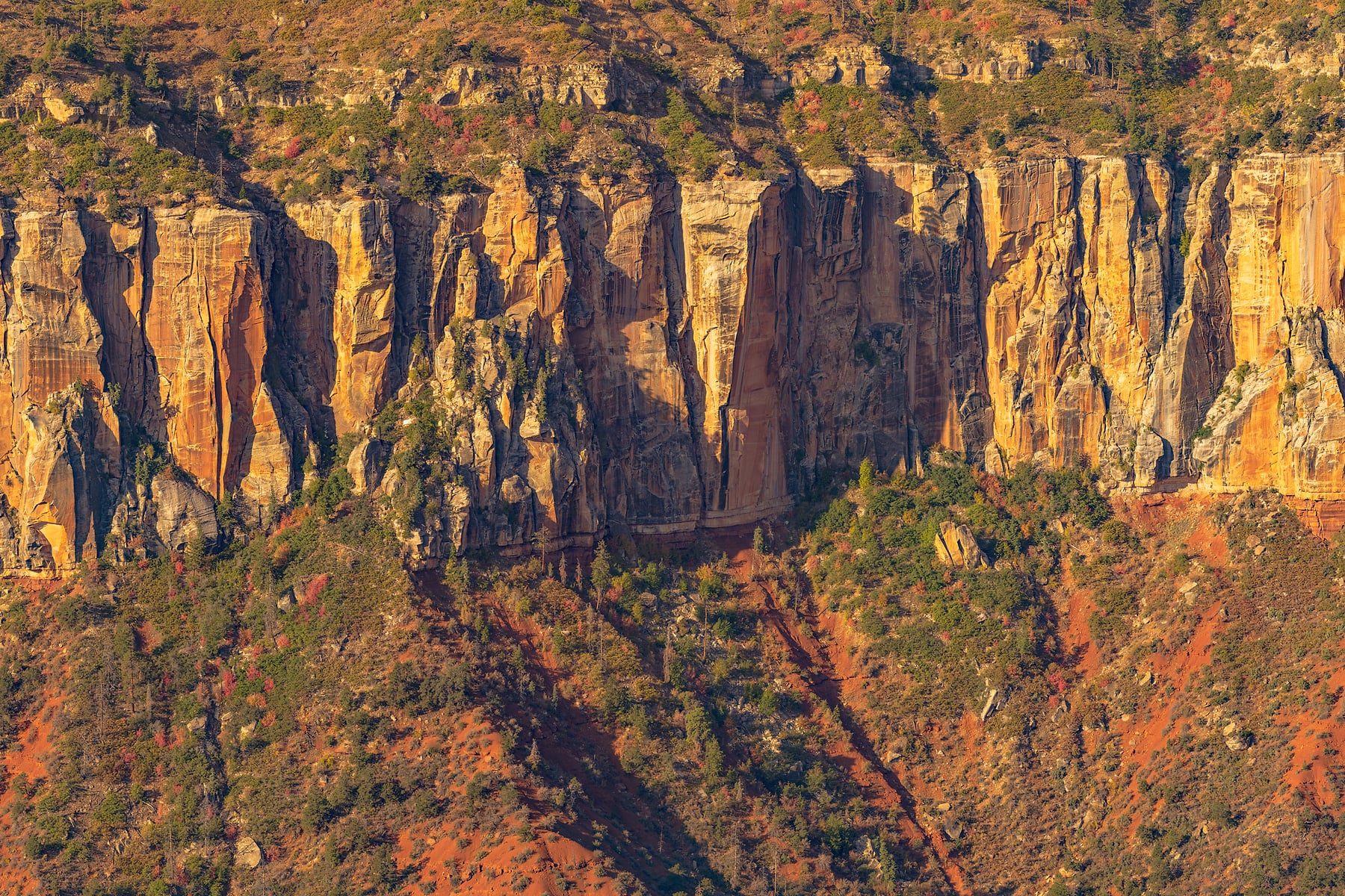 The morning I shot this, my wife and I were up early around 5am to drive the 60 minute drive from our campground at Jacobs Lake to the North Rim visitor center. We arrived right before sunrise only to discover that the trail to Bright Angel Point was closed for repairs. Disappointed, I scouted around for another location to shoot from. I discovered a overlook just below the Grand Canyon Lodge on a narrow outcrop that extended some 50 yards out from the canyon wall. I walked out to the overlook and this was the scene from it. I waited a while after sunrise for the light to extend down into Bright Angel Canyon some. While most of the trees in the canyon are evergreens there are a few scrub oaks and shrubs that are ablaze in fall color, especially along the right side of the panorama. It turned out to be one of the clearest days during this years visit. If you zoom into the image on the south rim you can clearly see the South Rim Visitor center along with the trail that descends down to the bottom.
