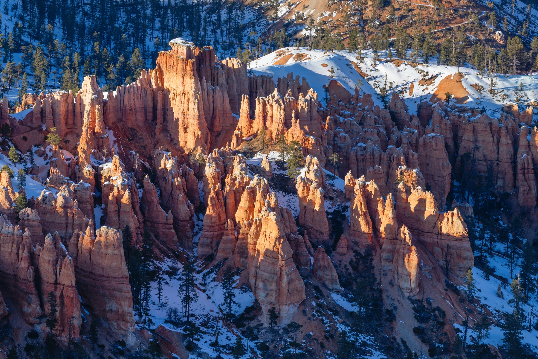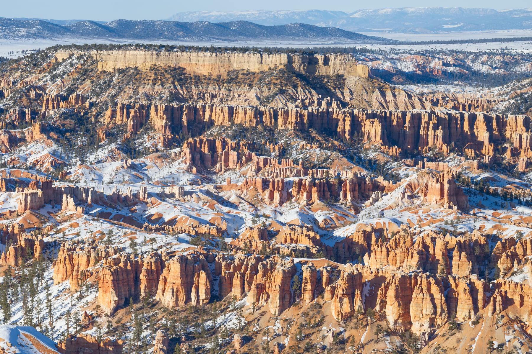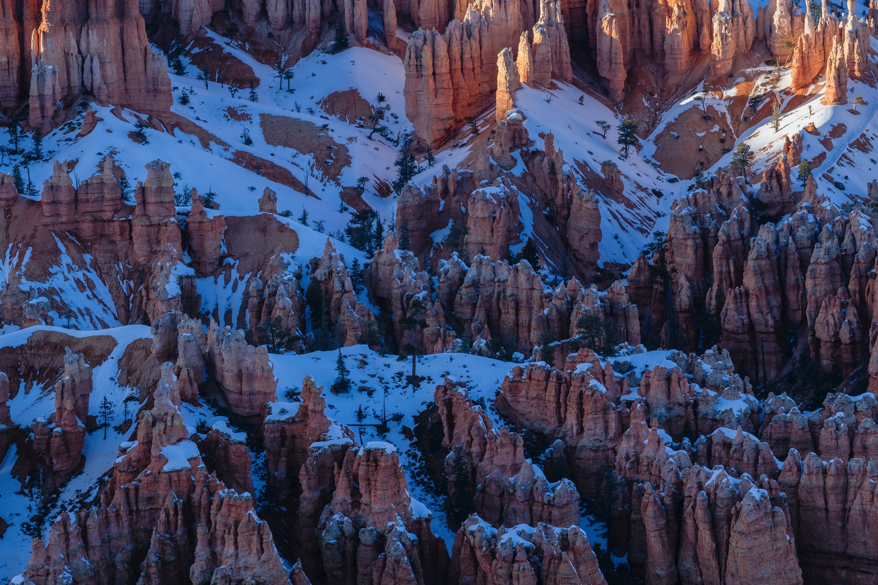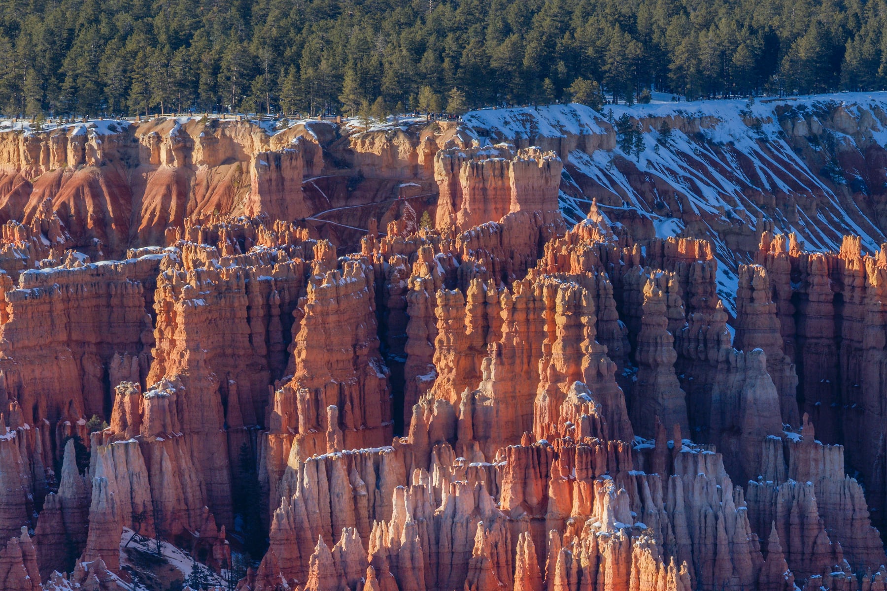 The view of Bryce Canyon from Bryce Point in the evening can be stunning. You can stare at it for hours watching the light really make the texture of the hoo-doos pop with the evening crosslight. Their orange color really comes alive and when you add in snow its just that more amazing.