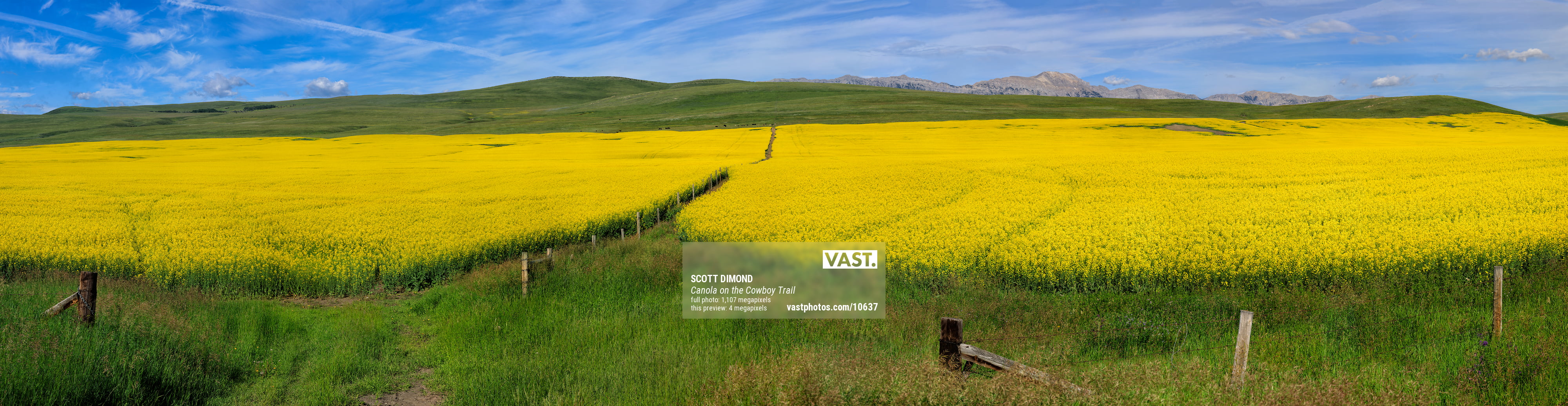 Near the very southern end of the Cowboy Trail, in what is predominately high ranching country, are some open vistas that provide for rare opportunities for agriculture along this part of the trail. I had driven by this location about a week before this photo was taken but I knew I needed to return, while the canola was still in full bloom, with the equipment needed to create a VAST photo