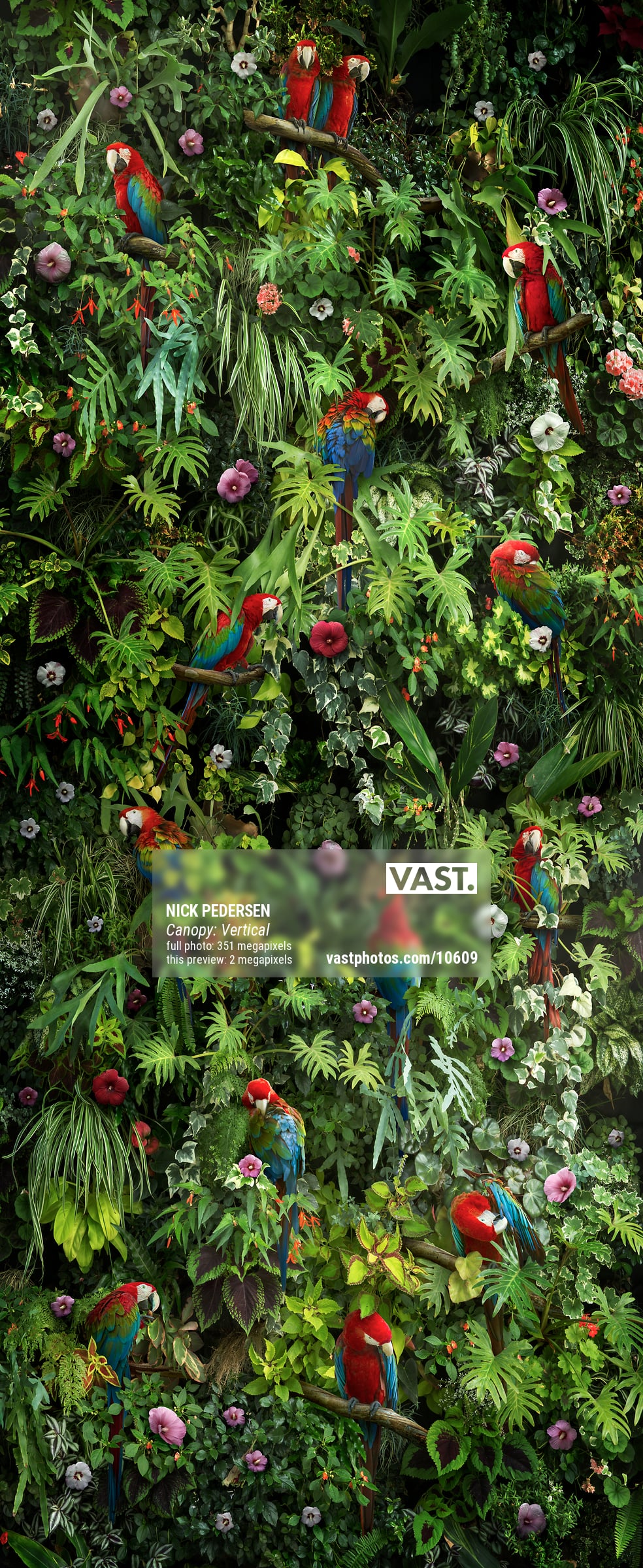 To create this image I photographed all of the imagery at a few botanical gardens, horticultural centers, public parks, and aviaries. Then I use a complex process of digital imaging in Adobe Photoshop to composite the imagery together. The final image is actually made up of more than 50 photographs meticulously pieced together. This process required a lot of effort building up the final seamless image, figuring out the lighting, shadows, color, and other effects to make it look realistic. Each image is carefully planned out and created as an intricately layered construction, which gives it such a hyper-real, illustrative quality.