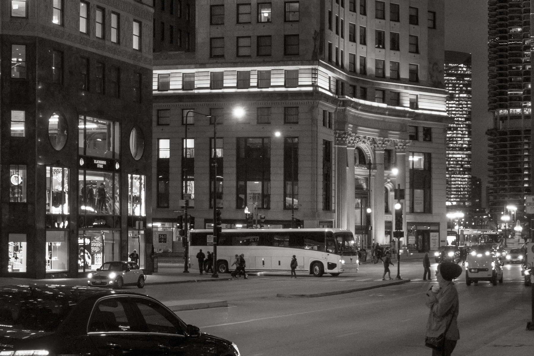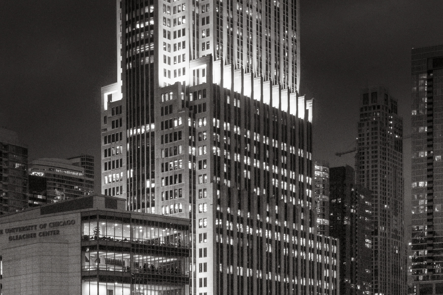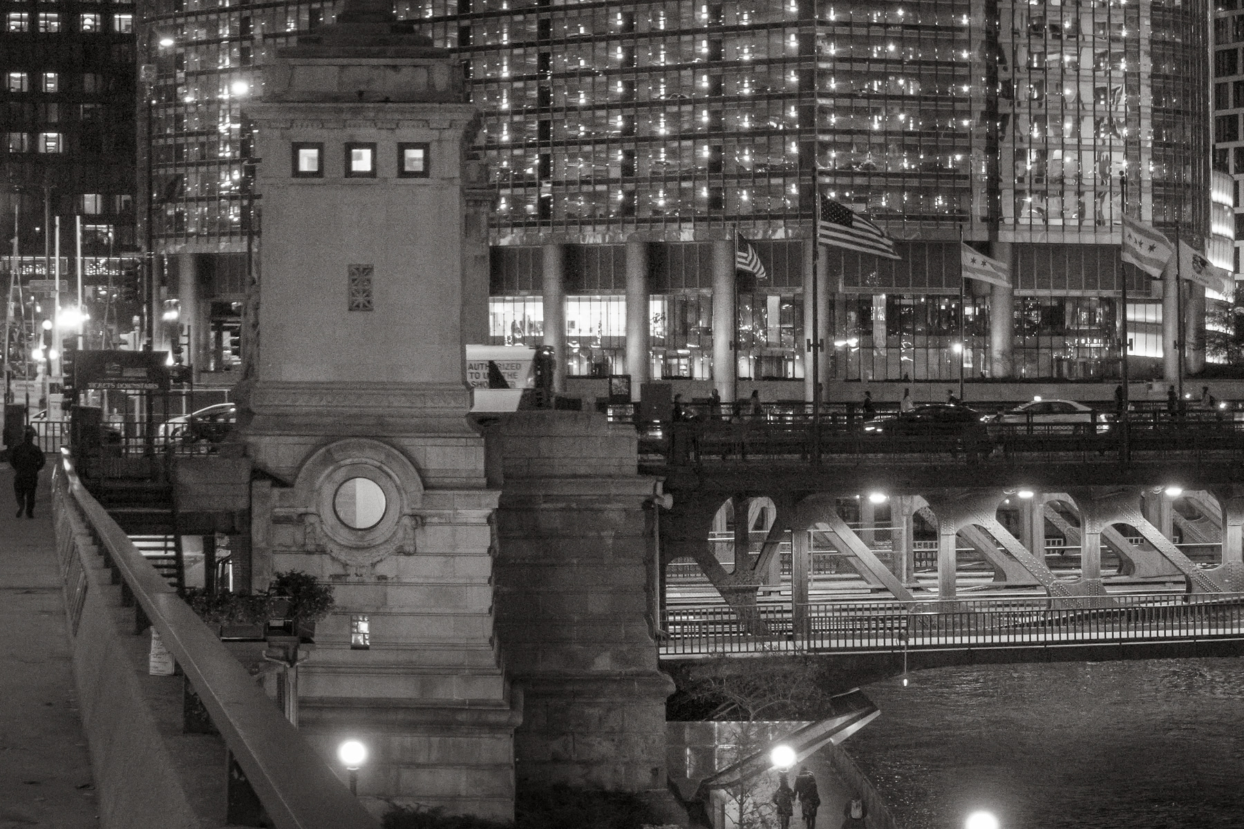 Chicago is one of my favorite cities. I think it may be the food, but no, actually - it is probably the full monty of experience. I love its architecture. It's a real city somehow with its wide streets and the Chicago River, the gracious, skyscrapers and....well the people are amazing as well. There is an energy to the place that makes you want to get out and walk. I have only been there in amazingly pleasant weather, so I haven't had the windy, cold, blasting experience. The day I took this shot, it was a mild November evening. You could smell the incoming winter and the city beckoned. I let it draw me to where I had to be to get a cityscape and let the buildings come to me.