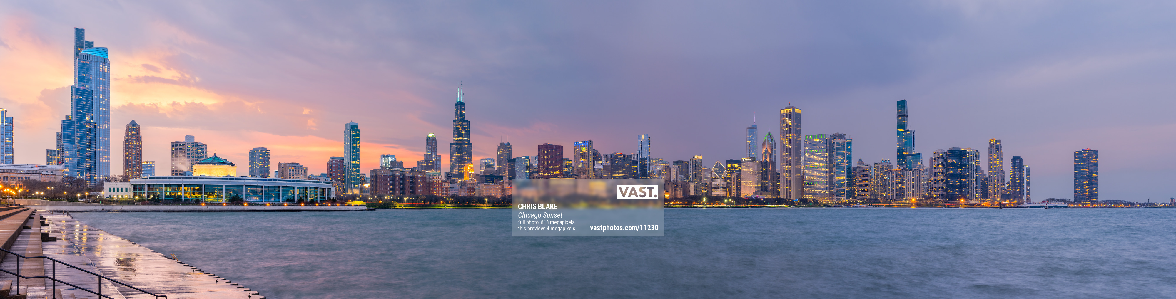 This beautiful sunset shot of the Chicago skyline was created on the Skyline Walk, between the Adler Planetarium and the Shedd Aquarium. This image includes most of Chicago’s famous buildings. You can see the Willis Tower, formerly the Sears Tower which is the second tallest building in the United States. The Aon Center was formerly known as the Standard Oil building but changed its name after the company rebranded. The building itself was forced to undergo its own type of rebranding when its marble facade had to be replaced with granite as the wind in the Windy City was knocking the marble loose and creating a fall hazard. The historic Palmer House can be seen to the right of the Shedd Aquarium, while today it is a Hilton Hotel when it was built it was one of the most extravagant wedding gifts of the time from Potter Palmer to his beloved Bertha. The John Hancock Center is the seventh tallest building in the US and is seen on the right-hand side of the image.