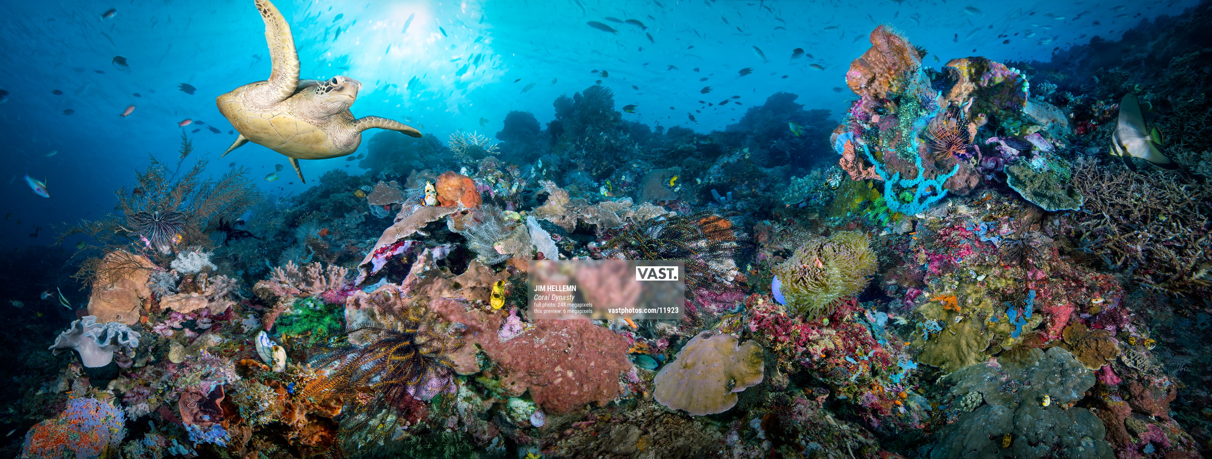 This high resolution photo-composite was captured in over 50 individual frames, resulting in exceptional resolution and extreme details. Various marine life is captured in this image, including Green Sea Turtles, Clown Fish, Lionfish, Crinoids and more.