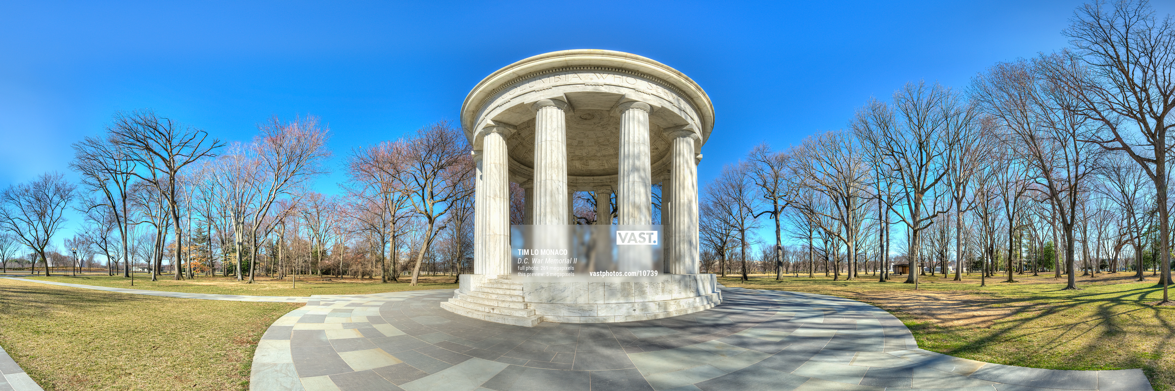 Keeping in line with the iconic architecture that comes to mind when thinking of D.C. monuments, the D.C. War Memorial fits perfectly into the very walkable National Mall. While I love the weather and green foliage during the warmer months, I am fascinated to see the forms of naked trees in the colder months contrasting the crisp blue skies of winter. Ash Woods, nature’s counterbalance to the man-made structure keeps me coming back to photograph this location. The field of view of this particular image is about 280 degrees, nearly three times what a conventional wide-angle lens would provide.