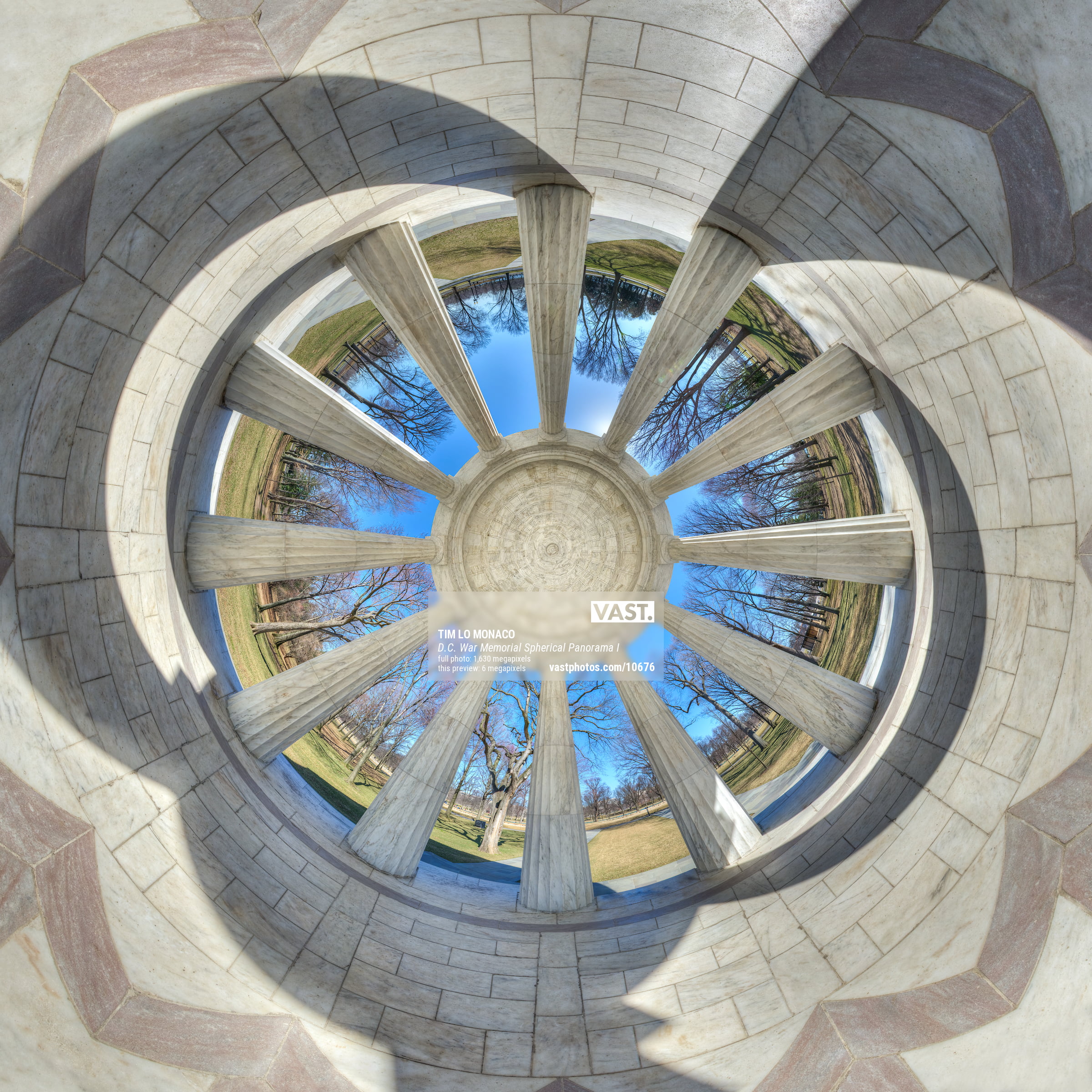 To create a spherical panorama or “little planet”, imagine taking photos of every angle as viewed from where you stand, including the point under your feet. Combine all those photos into a single image and the end-result would be a three-dimensional sphere. Flatten that into two-dimensions and you have what you see here. I chose the ceiling as my center point in this version, as the symmetrical monument bends into this fascinating perspective.