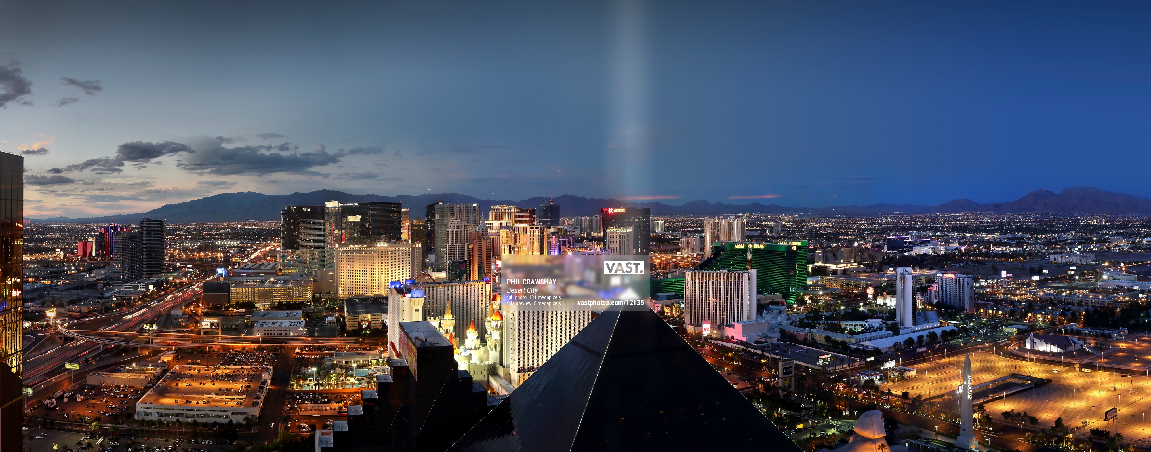 large format, high-resolution panoramic photograph capturing the Las Vegas Strip from above as the sun sets over the Nevada desert. Taken from a high vantage point, this view shows the full sweep of the Strip as it begins to light up for the night. Iconic landmarks like the Luxor, City Center, and the MGM Grand stand out against a glowing blue evening sky.