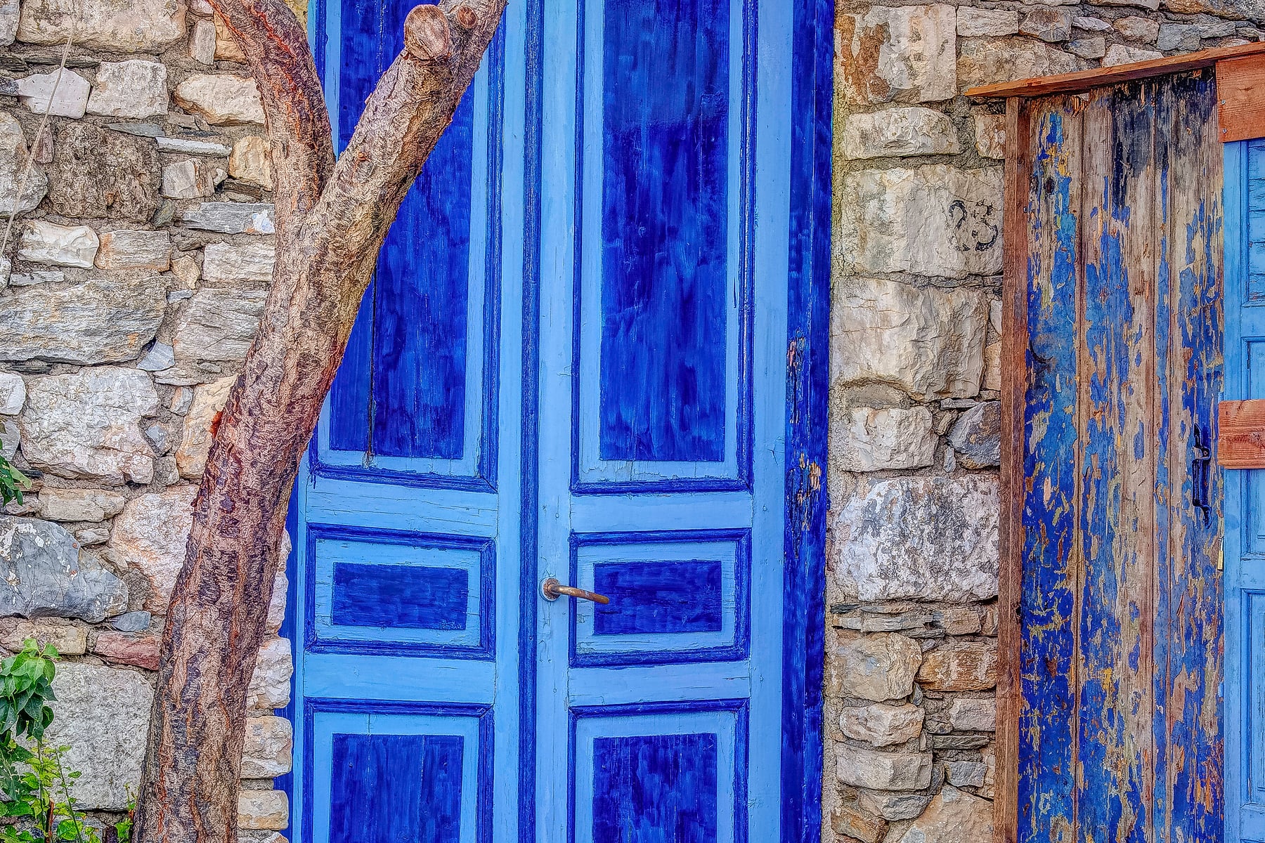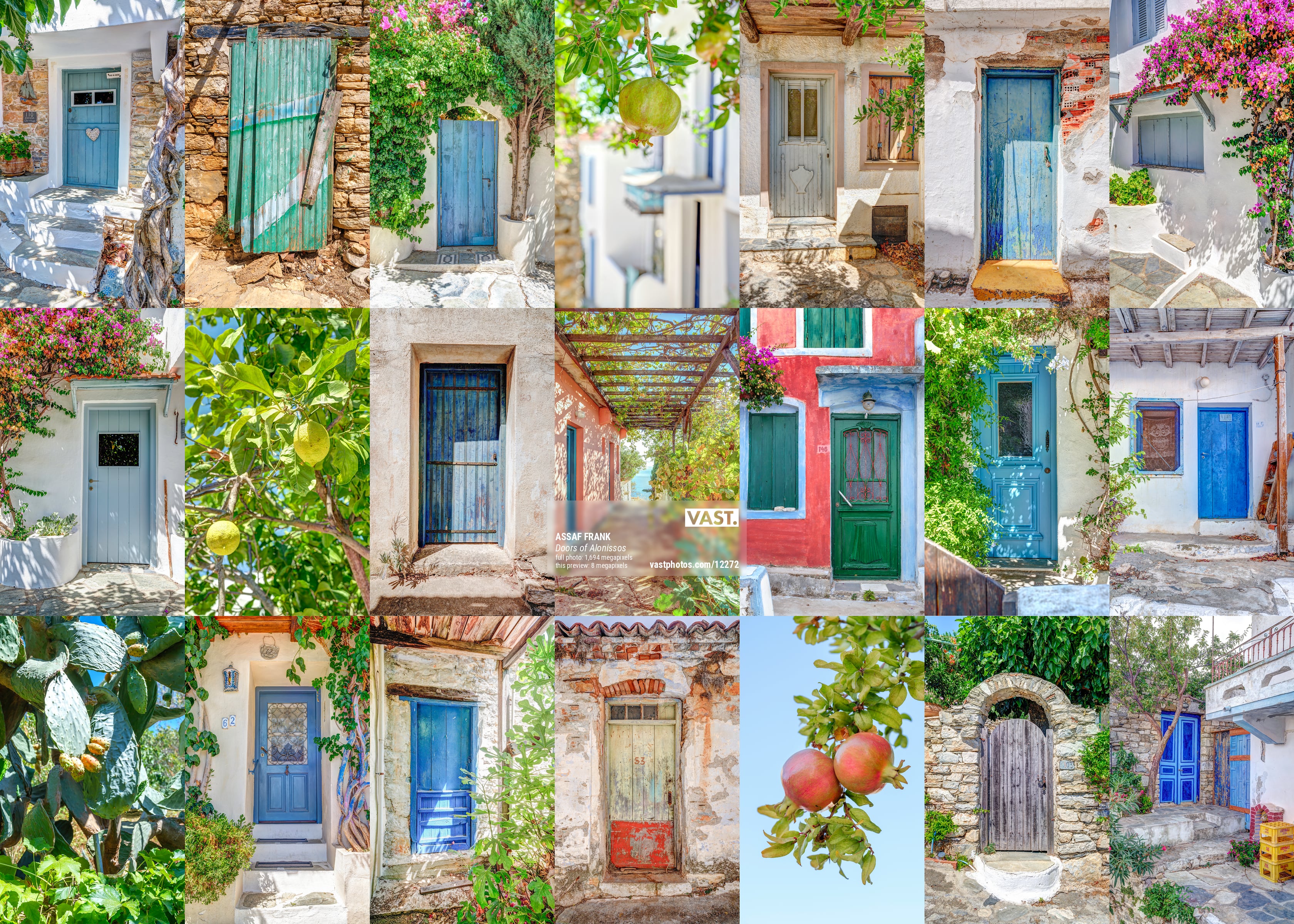 This vibrant collage showcases a collection of charming doors from Alonissos, a picturesque island in the Greek Isles. Each door, framed by lush greenery, flowers, and stone walls, highlights the rustic architecture and colorful aesthetic unique to Greek island homes. The combination of blue, green, and pastel hues evokes the island’s tranquil atmosphere and Mediterranean charm.