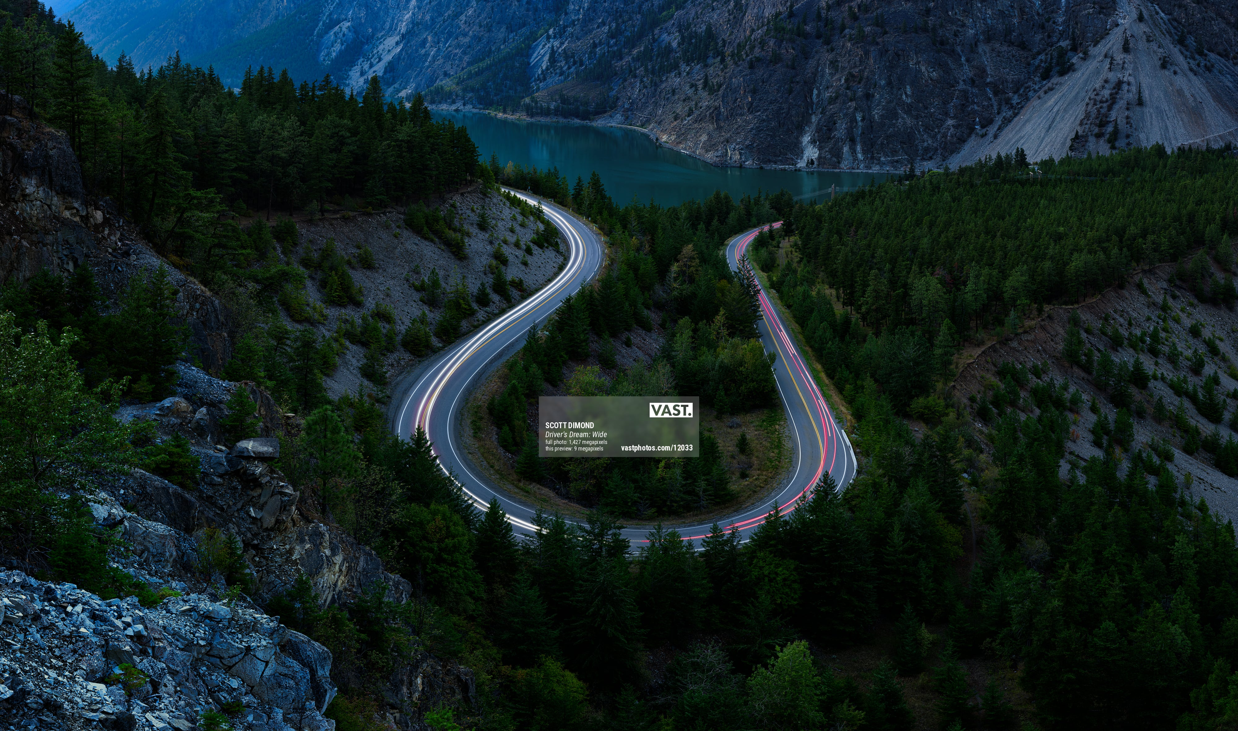 If you are familiar with how the very large VAST images are photographed and assembled, you know that many "zoomed-in" photos are taken across the scene and then combined to create one image with a wider view and incredible resolution. However, this technique prohibits the capturing of objects moving across the scene, as the camera needs to be moved to an overlapping position before the next "zoomed-in" photo can be taken. To create an ultra-high-resolution image that included the light trails of moving vehicles, I had to come up with a creative solution. Using a telephoto lens, I first captured nearly 1000 images that would be assembled into the ultra-high-resolution image. I then switched to a wider-angle lens with a field of view that covered the entire roadway, and as darkness fell, I used long exposures to capture as many photos as I could of the light trails of cars coming and going along the road. In post-production, once I had assembled the 1,400-megapixel image, I turned my attention to the light trail photos I had captured. From those photos, I selected the best one that showed headlights approaching, tail lights departing, and of course, some brake lights on the crazy curve. I then used that one photo with its light trails as a model to faithfully recreate the exact same light trails in the ultra-high-resolution image. The result is an ultra-high-resolution image that accurately represents the beautiful car light trails that were captured on the loop.