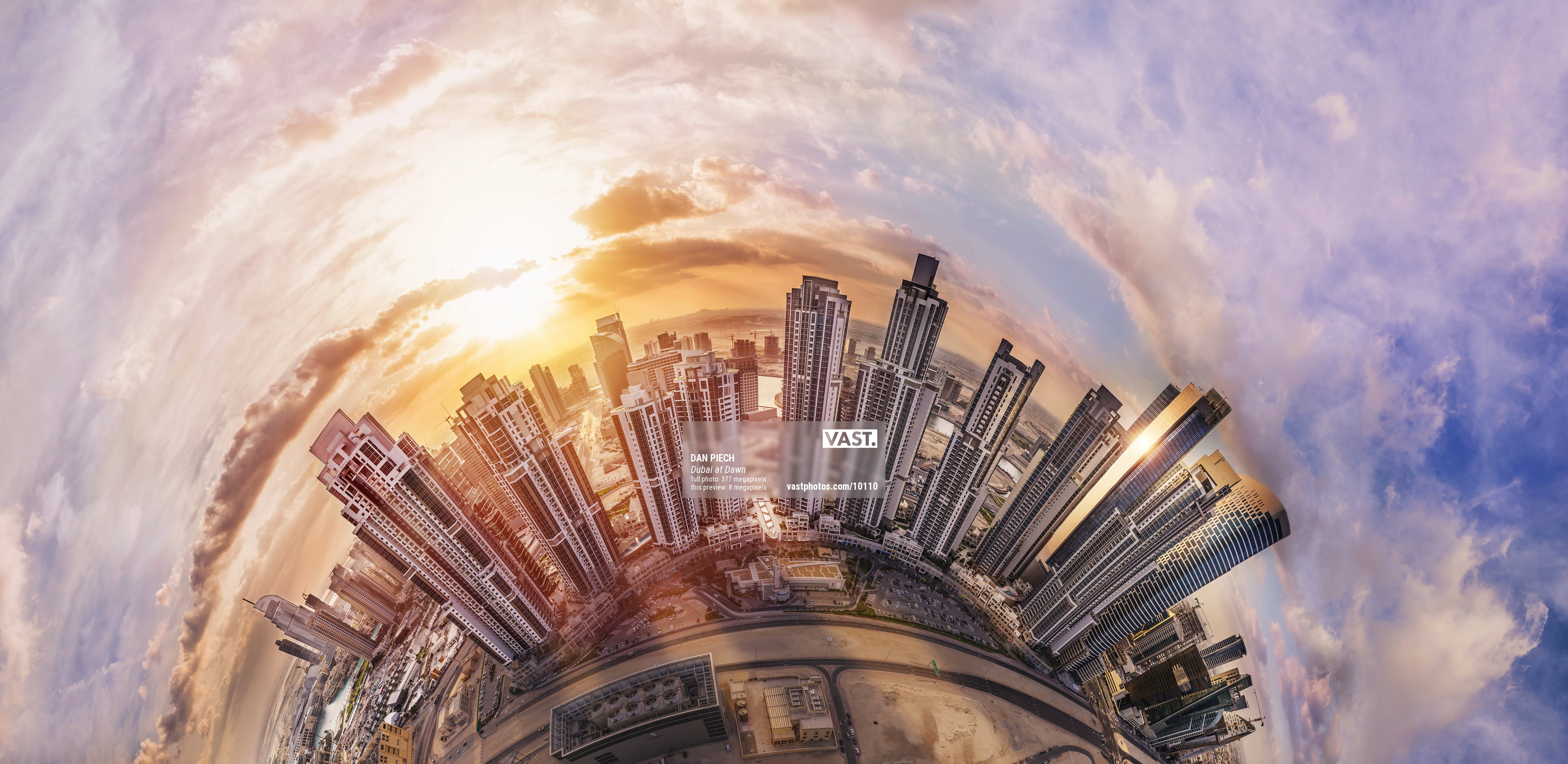 As the sun came up over the desert and streaked between the towers, the sky filled with a wispy haze of clouds. I was on the rooftop of a nearby building and exposed more than 100 photos to stitch together into this scene. When Dubai does something, it does so in an over-the-top fashion; so much so that every corner of the city is a cliché of tacky excess and architectural melodrama. To evoke a similar feel, I decided to wrap the photo into a semi-sphere.