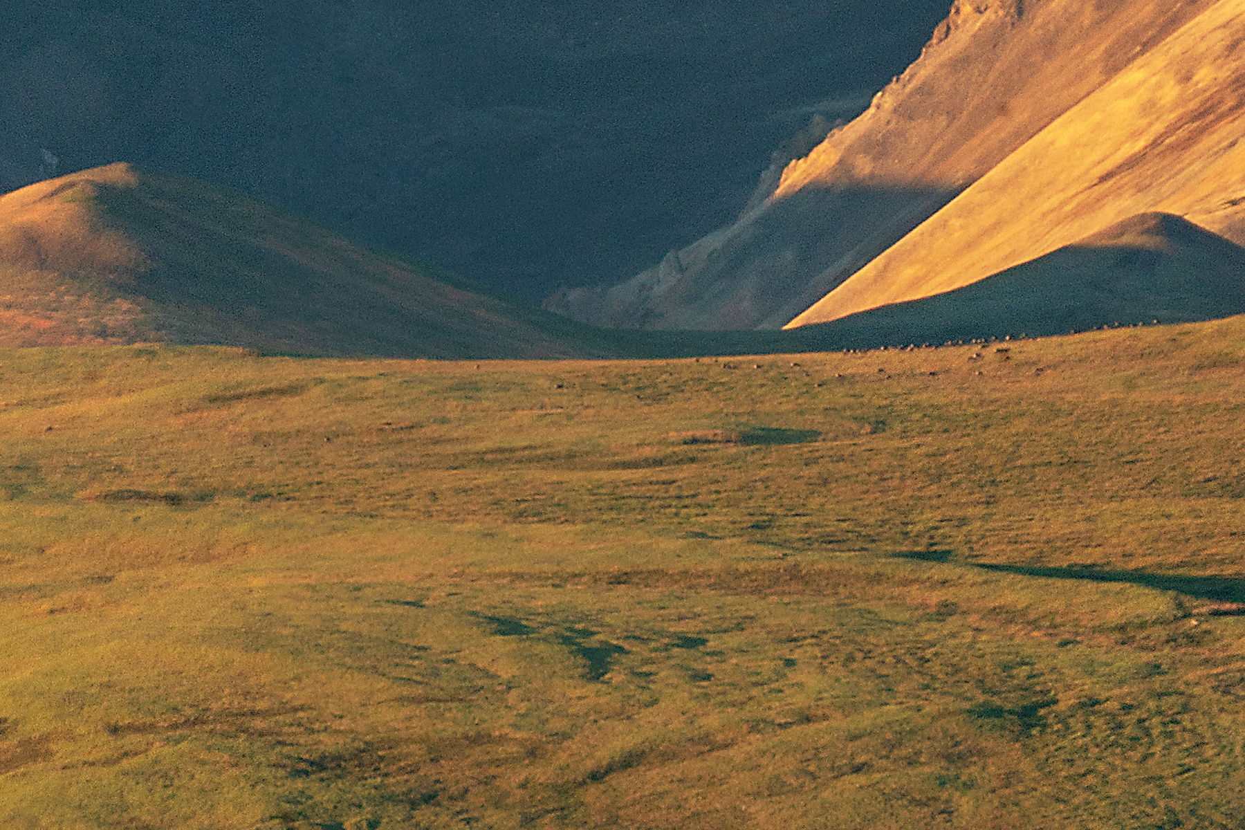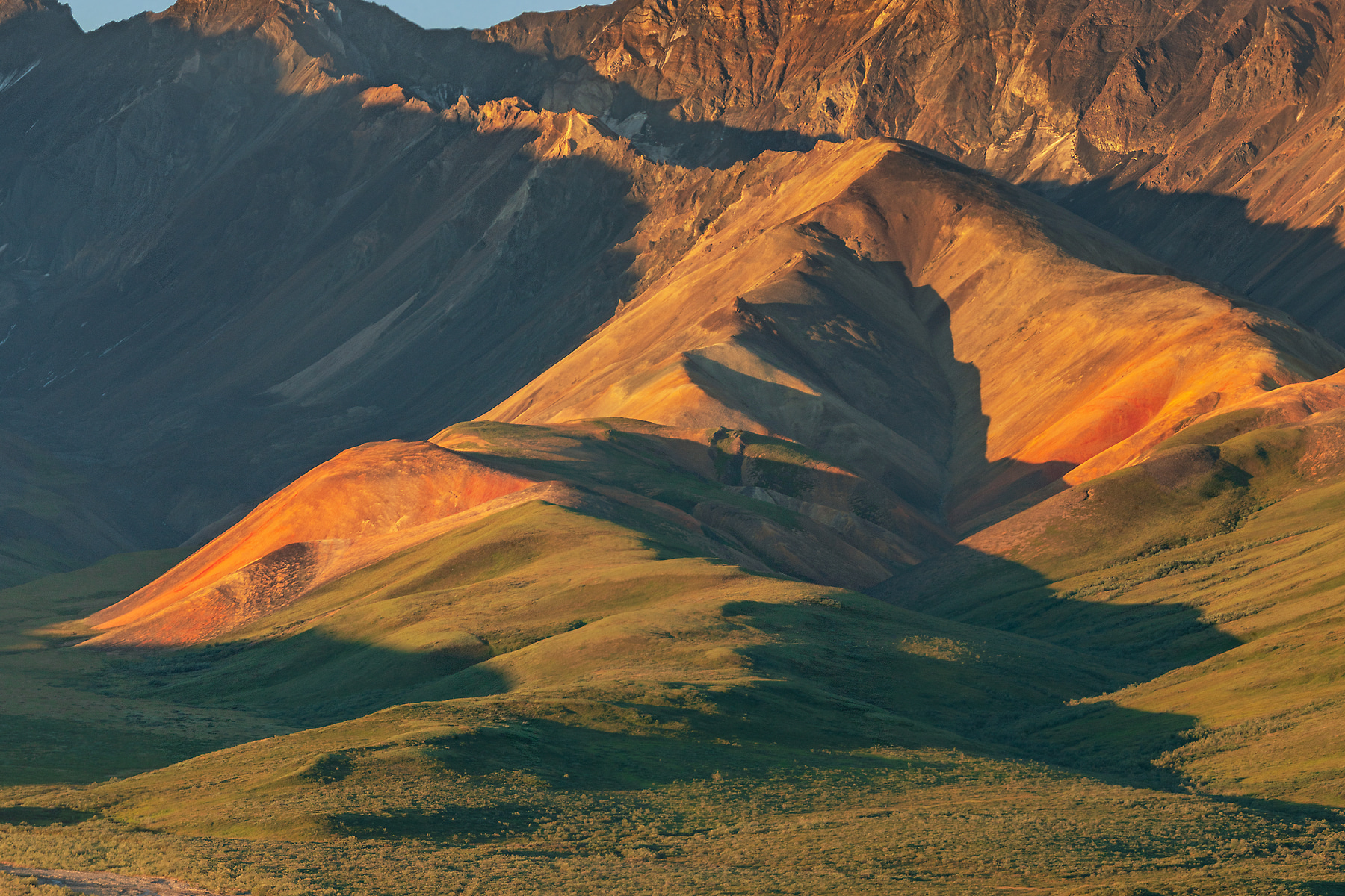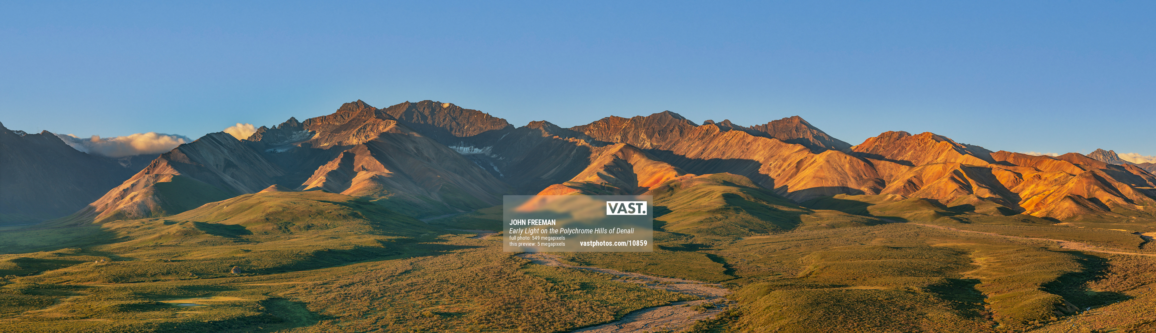 My Professional Photographers Pass allowed us to be at this location at sunrise, long before the tour buses started their daily runs. This rare day of nearly blue skies allowed the rising sun to paint the hills in dazzling light. A herd of grazing caribou are visible center left.