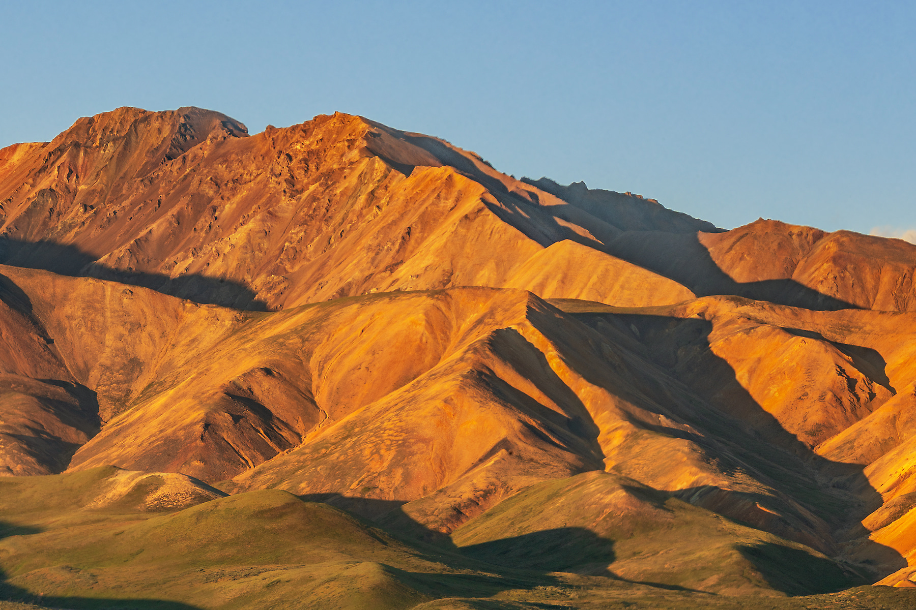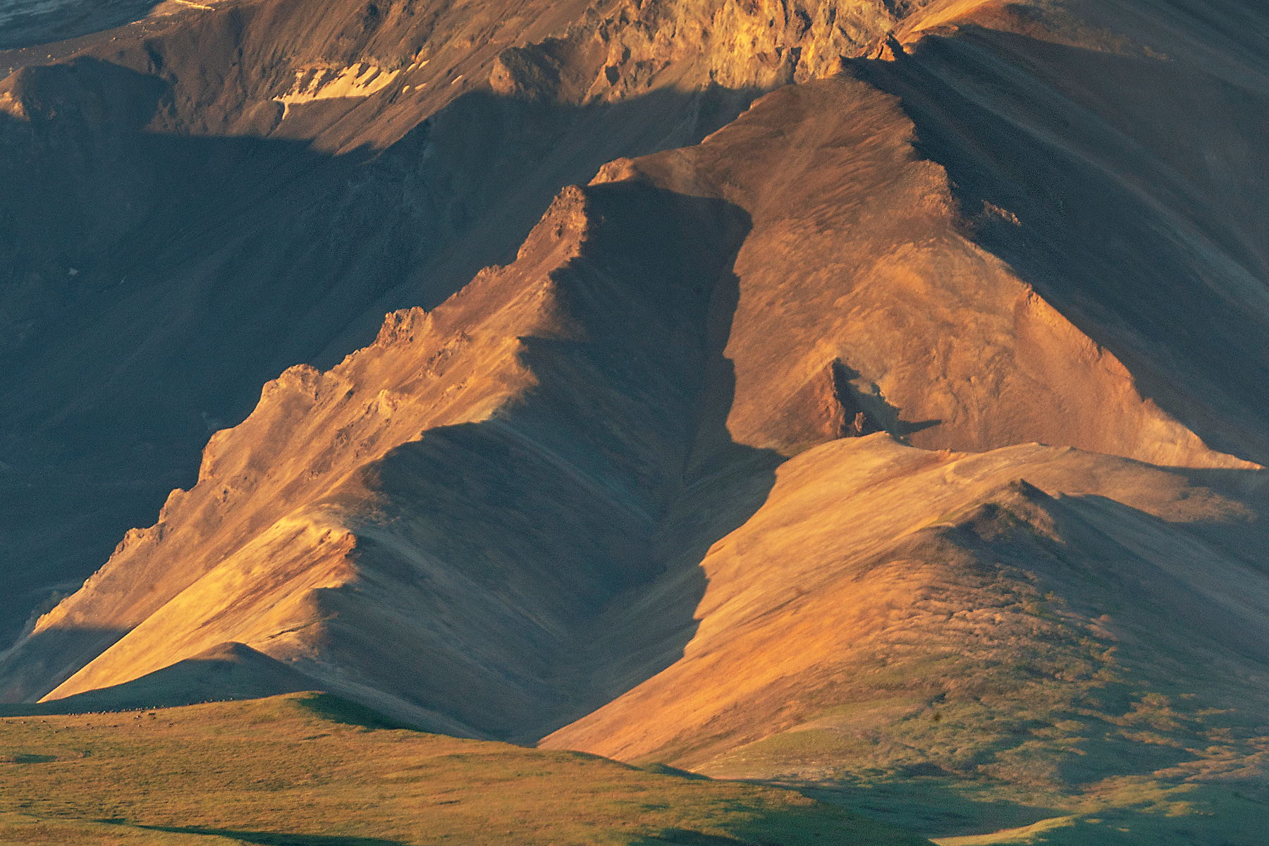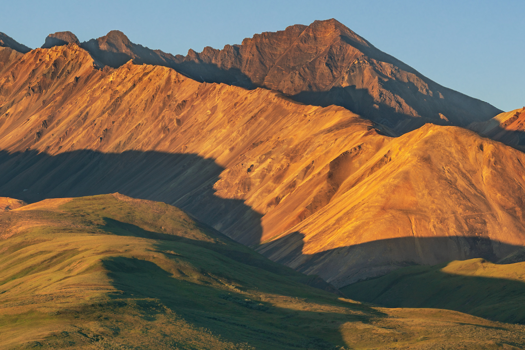 My Professional Photographers Pass allowed us to be at this location at sunrise, long before the tour buses started their daily runs. This rare day of nearly blue skies allowed the rising sun to paint the hills in dazzling light. A herd of grazing caribou are visible center left.
