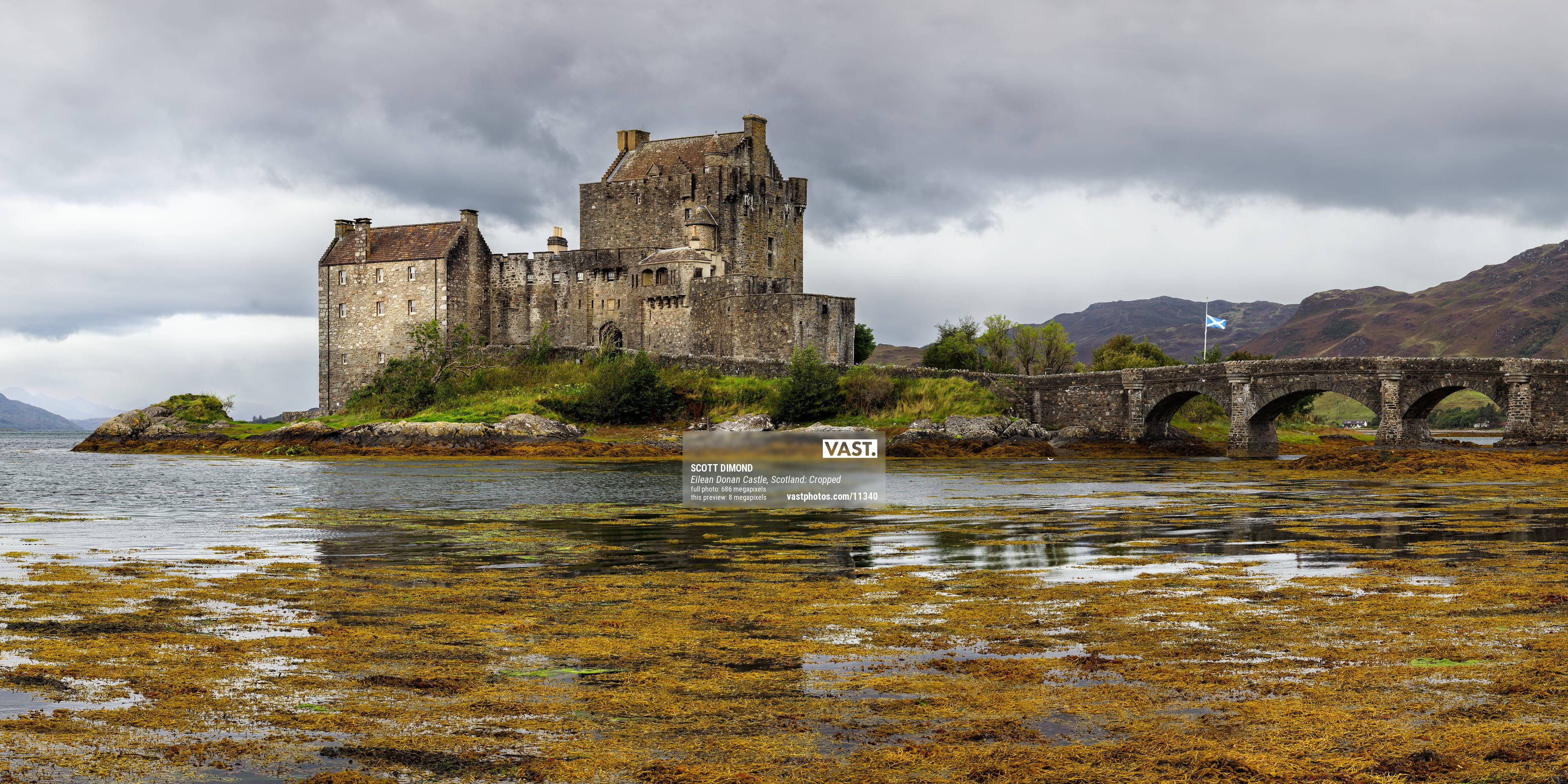 On a recent trip to Scotland, Eilean Donan was high on my list of locations where I hoped to capture and create an ultra-high-resolution VAST photo. I knew that the famous Scottish weather was sure to be a challenge in my quest. Capturing all the images that will be assembled to create an ultra-high-resolution image, like this one, takes time. And in Scotland, time means changing weather. It can be cloudy and raining one minute and then suddenly the sun can appear, illuminating only certain areas of the landscape only to disappear as quickly as it appeared. Changing weather is the enemy when creating ultra-high-resolution VAST photos. When I arrived on location at Eilean Donan, I was greeted with bright but overcast conditions and with good cloud definition. That was the perfect moody weather to match the iconic castle in its iconic location. If that weather and light remained constant, it would be the ideal situation for capturing literally thousands of photos that would be assembled into one homogeneous scene.