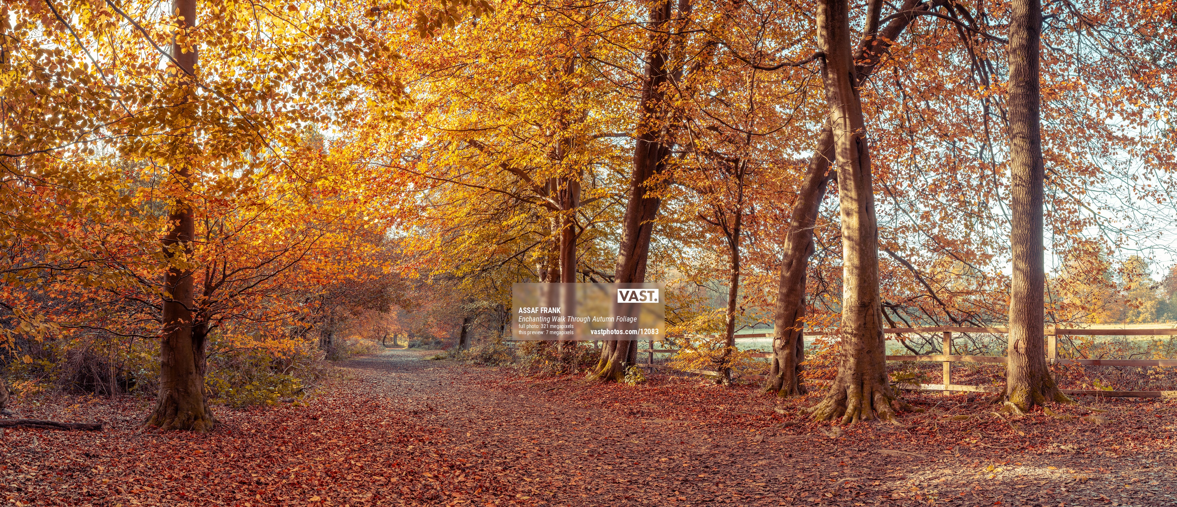 This captivating autumn scene invites you to take a tranquil walk through a serene forest pathway blanketed in a thick carpet of golden leaves. The towering trees, adorned with vibrant shades of amber, gold, and crimson, form a breathtaking natural canopy that filters the sunlight, casting a warm, golden glow across the forest floor. The rustic wooden fence on the right adds to the charm, guiding the eye further into the picturesque landscape, creating a sense of depth and immersion in nature's seasonal splendor.