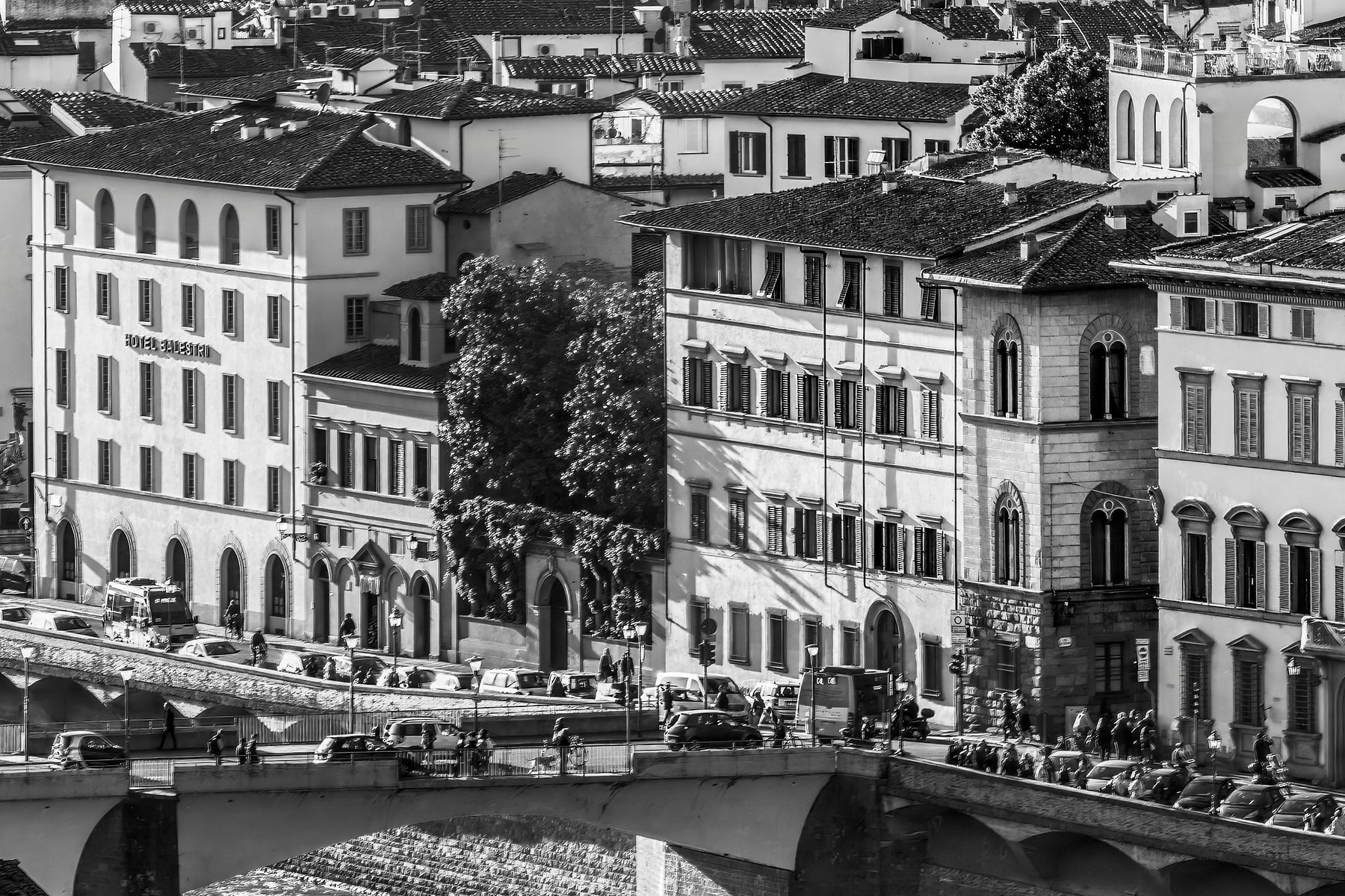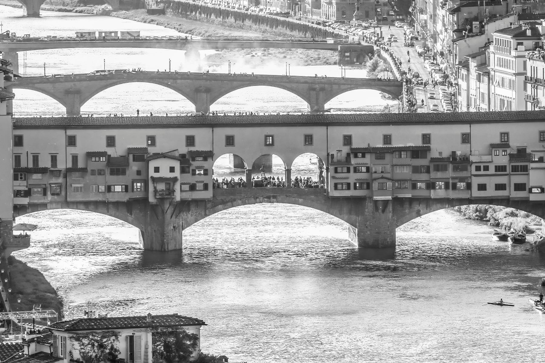 From the Piazzale Michelangelo on the south side of the river, you get a sweeping view of the city, and are able to see in incredible high resolution detail all of the famous locations and attractions. This includes the Cathedral of Santa Maria del Fiore on the right with its beautiful red-tiled dome (the "duomo"), and even Ponte Vecchio, the famous bridge filled with high-end shops and wonderful views of both sides of the embankments of the Arno river.