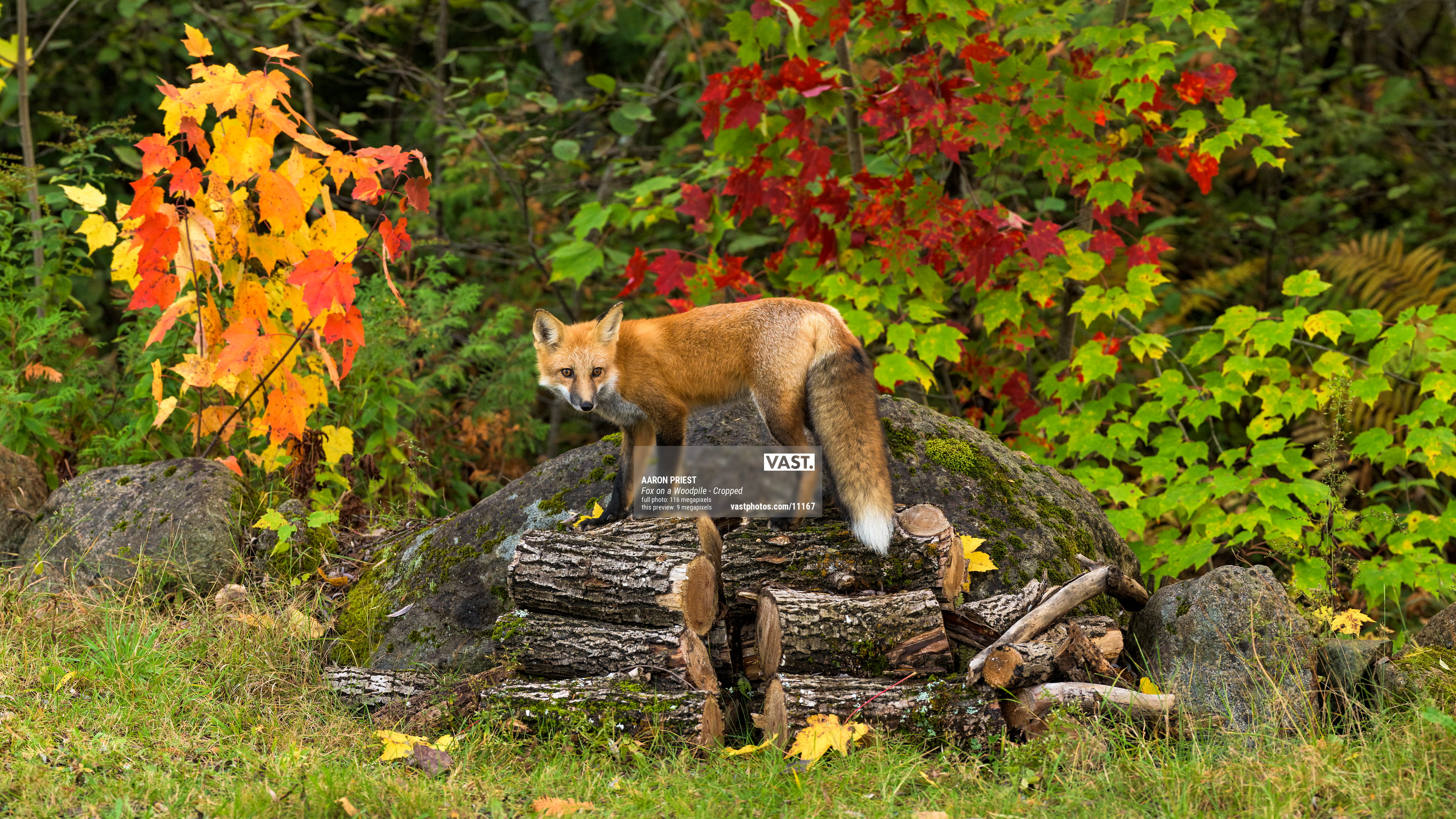 This red fox had a den nearby and had been seen mousing around this woodpile and along the rock wall. I was camping in the area and revisited the spot a few days in a row. I shot a panorama of the background and left a remote-controlled camera on a tripod pre-focused on the wood pile. One afternoon my patience paid off and the fox came out for a visit!