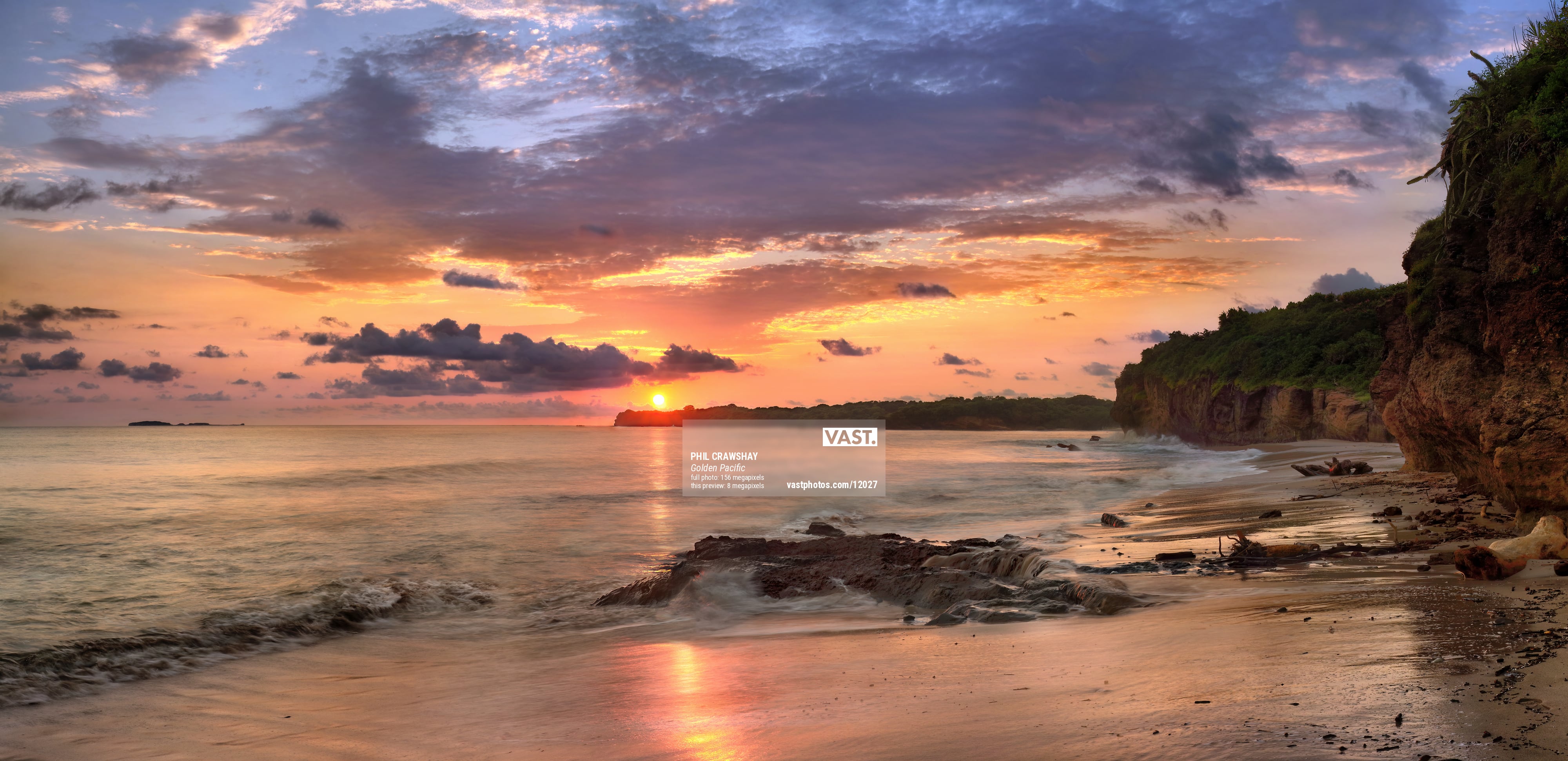 This stunning large-format photograph captures the serene beauty of a sunset over the Pacific Ocean in Punta Mita, Mexico. The sky, painted in a harmonious blend of golden hues and soft blues, is adorned with puffy cumulus and delicate sheet clouds, adding depth and texture to the scene. In the foreground, moderate waves lap gently over a small rock formation, their motion creating a tranquil rhythm. The midsection reveals a rugged yet inviting coastline, where small cliffs rise gracefully, their rocky bases transitioning into lush green foliage at the top. The interplay of land and sea is both dramatic and serene, showcasing Punta Mita's unique charm—a balance of rugged natural beauty and peaceful coastal serenity. This image invites the viewer to immerse themselves in the golden hour's embrace and the timeless allure of Mexico's Pacific coastline.