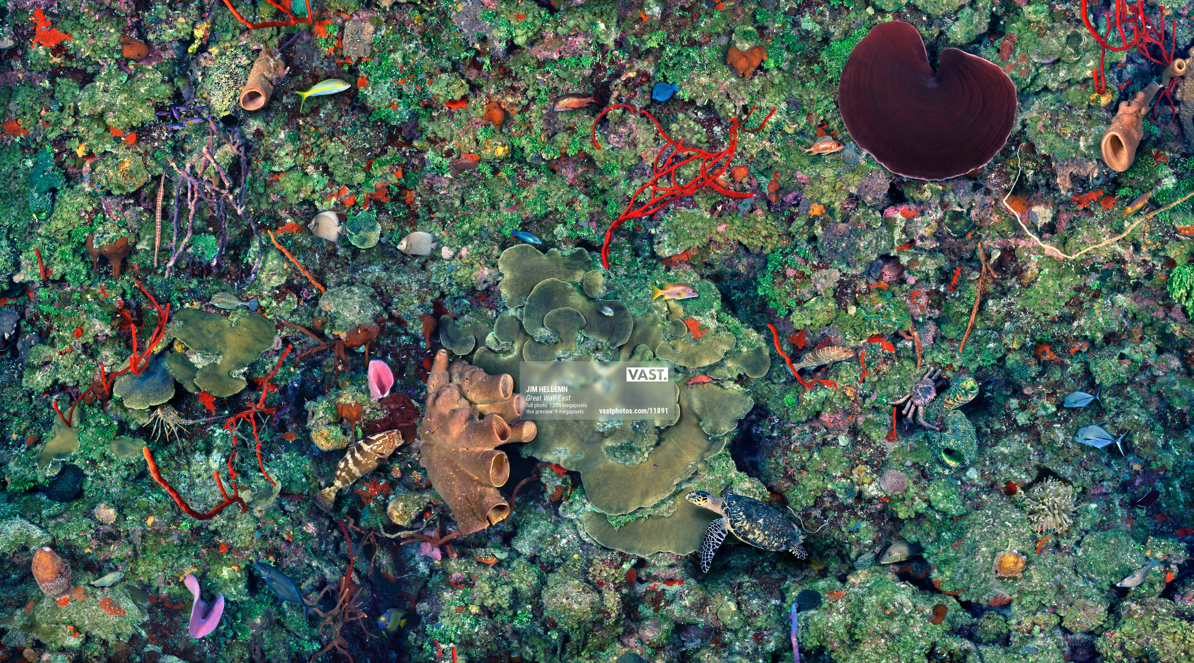A portion of the famous dive site “Bloody Bay Wall” is captured in this life-size photomosaic, assembled manually from hundreds of 35mm slides taken with a Nikonos V camera mounted on a custom underwater platform.
