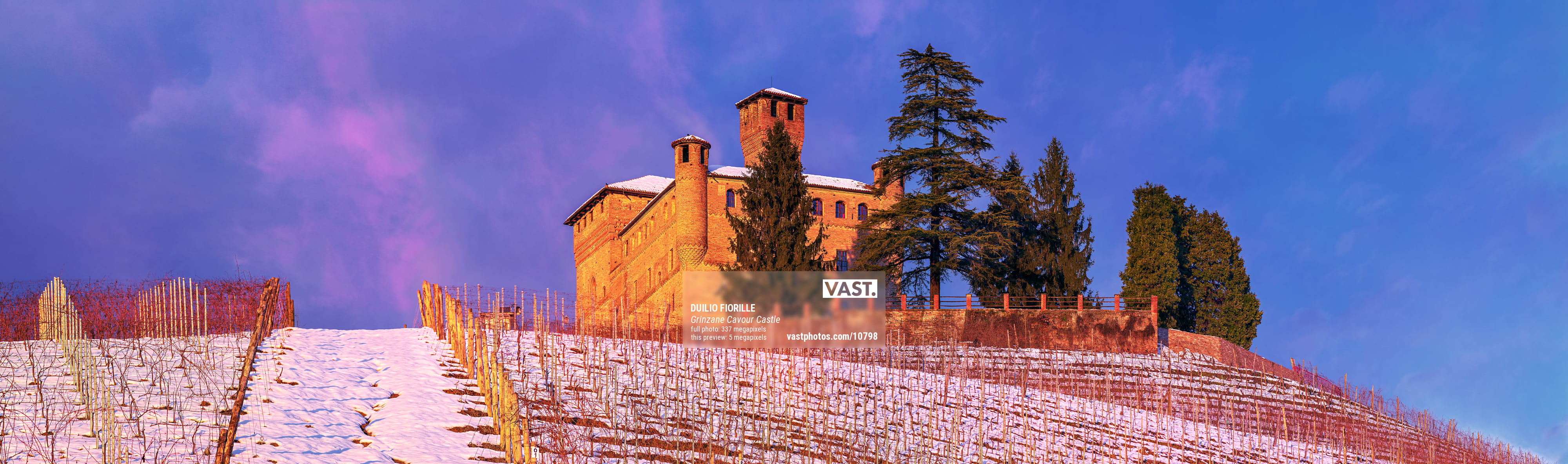 In this VASTphoto the castle has been photographed during a beautiful sunset on the first days of January 2021, with the surrounded vineyards snowed. These vineyards are famous for many wines, all five stars quality, renowned in all the world. Also in the winter season, the vineyards are extremely curated and clean, due to extraordinary quality of their grapes. Every row of the vine is numered and developed in a straight line with every single plants placed on a intricate wires structure to permit them to grow in the correct way and generate the precious wine in the autumn season